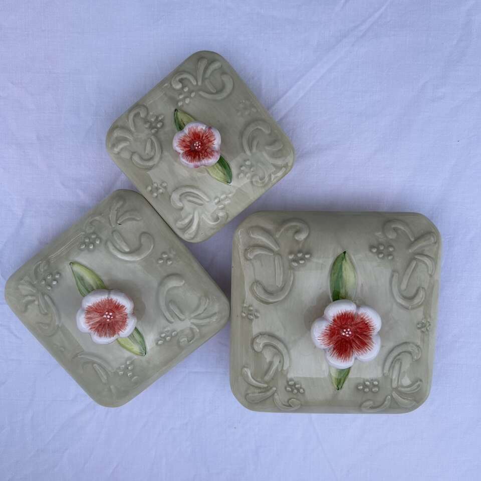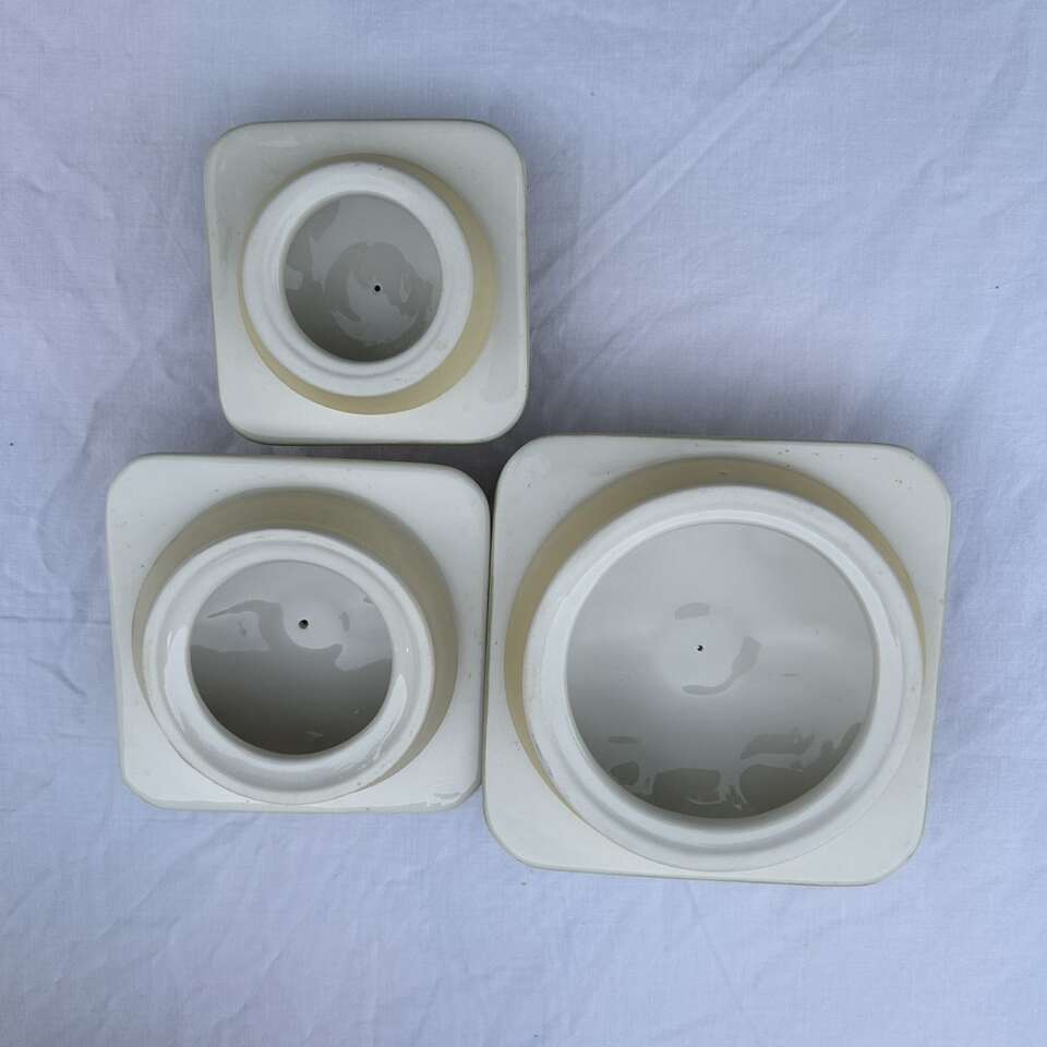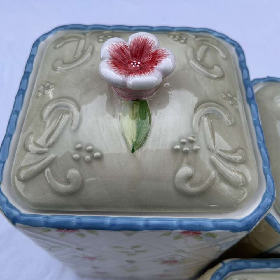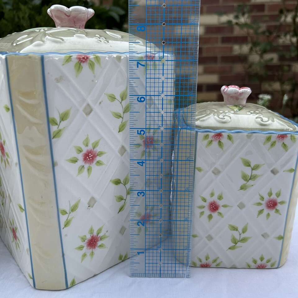 3 RARE matching Country Inn” Canisters. The color scheme is sophisticated beginning with a double lattice on an ivory background on each side with flowers & green leaves alternating in the diamond shapes. This is bordered by pale yellow on the corners and edged with sky blue. These lovely vintage canisters look more like a quilt than kitchen storage and could actually be used in a sewing room or in a bathroom. Versatile style lends itself to French Provincial, Cottagecore, Grandmacore, Grannycore, Maximalist, Pastel, and Shabby Chic interior decor styles. Made by Home Interiors for Better Homes and Gardens.