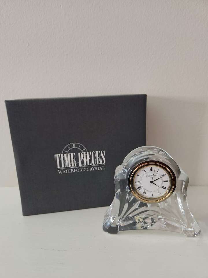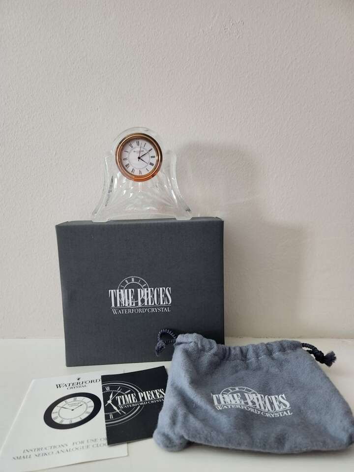 Small Waterford crystal clock. Made in Ireland. Like new and in original box with certification.. Uses size 377 watch battery.