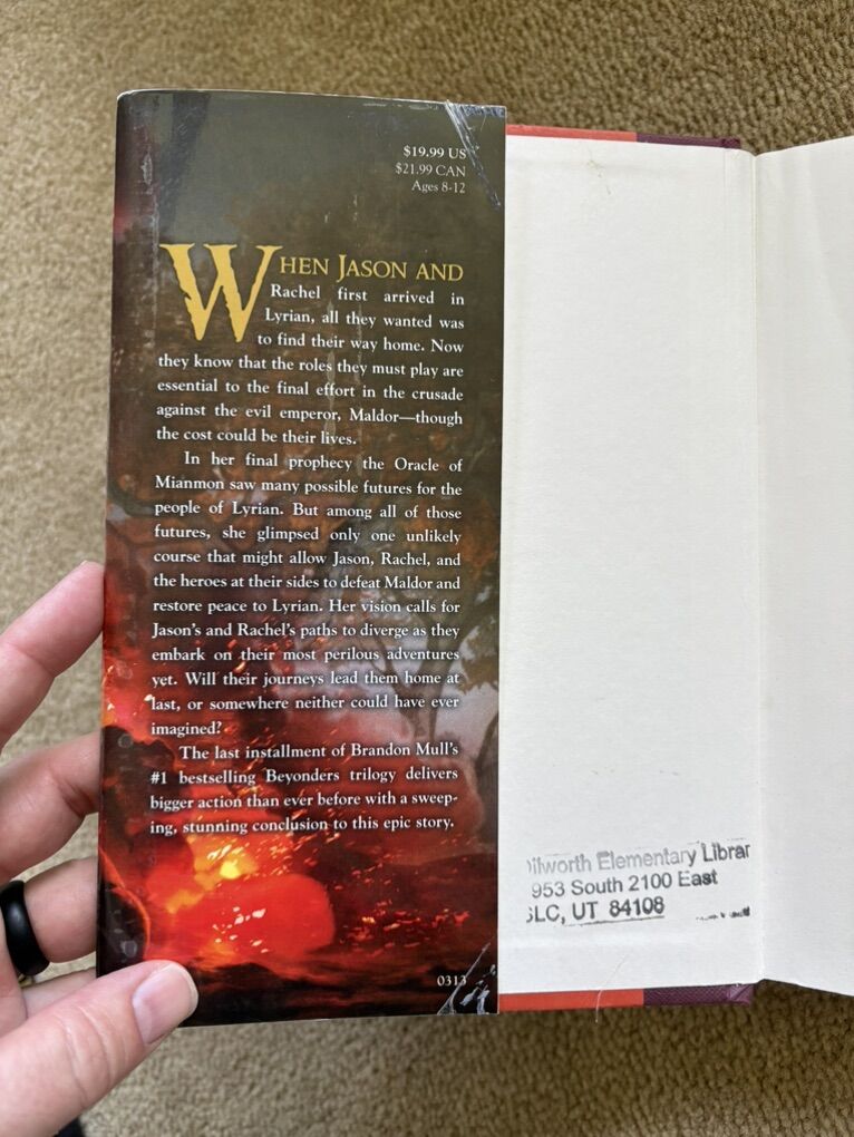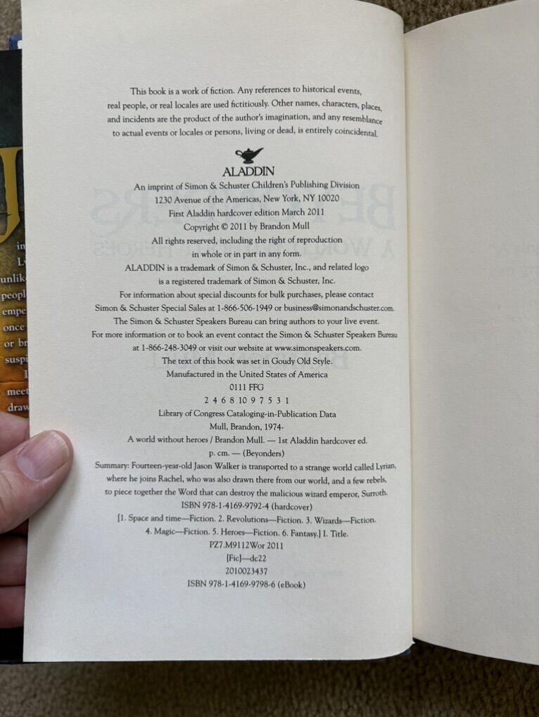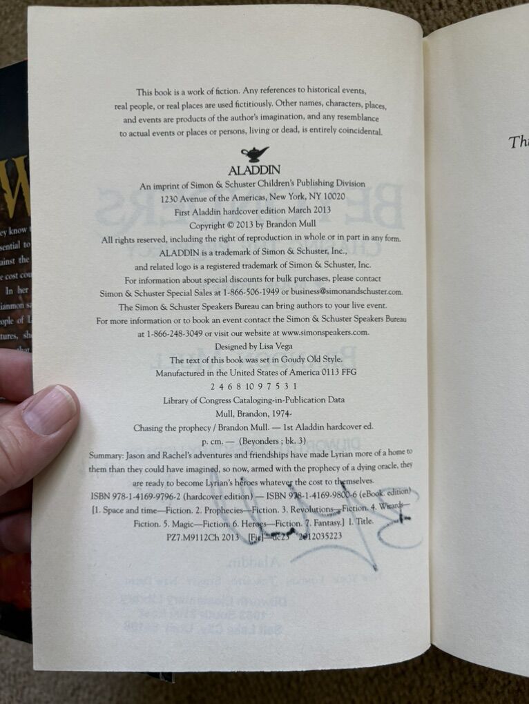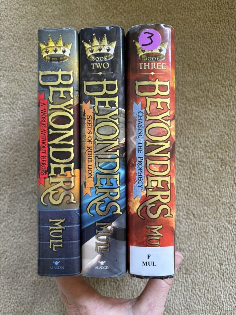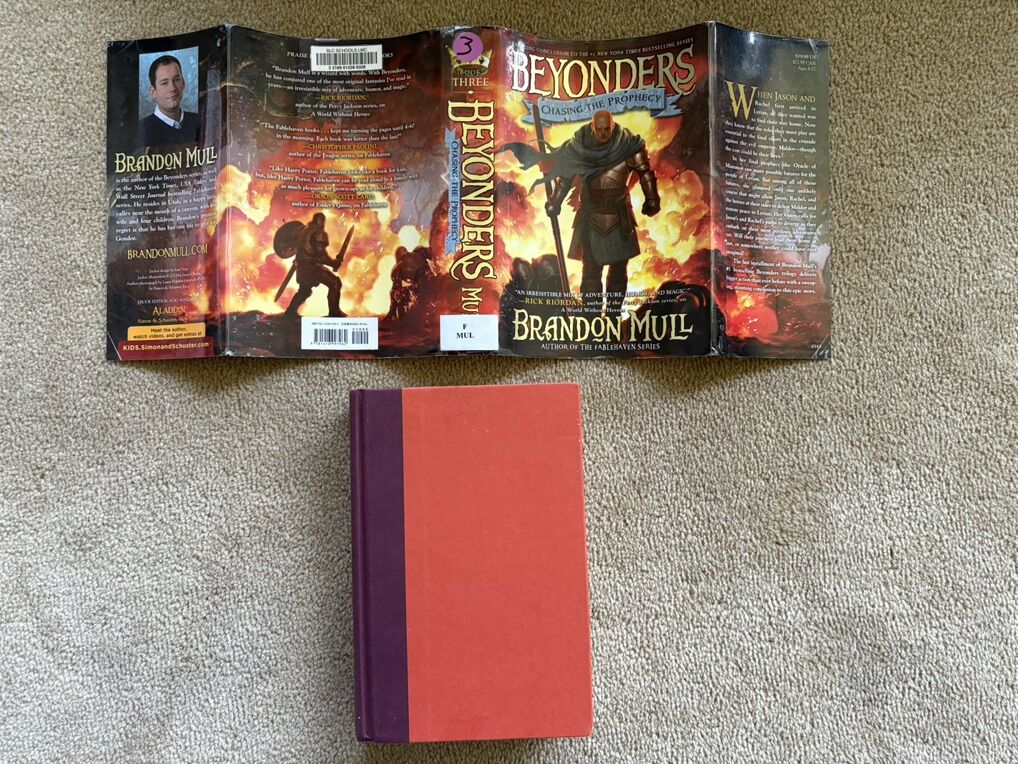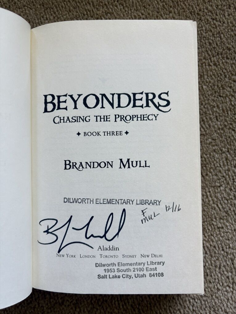 Complete Beyonders Series, by Brandon Mull (author of the Fablehaven series): A World Without Heroes (2011, 454 pages), Seeds of Rebellion (2012, 483 pages, including a bonus scene), and Chasing the Prophecy (2013, 506 pages, SIGNED). Hardcovers. Books 1 and 2 in excellent condition, including dust jackets. Book 3 is signed by the author on the title page. Former school library book in very good condition. Dust jacket has 3 library stickers and is laminated. Also has a few library stamps inside cover and on title page (see photos). No other marks or damage. Text only. Cash or Venmo.