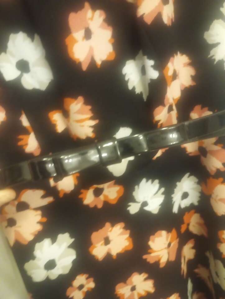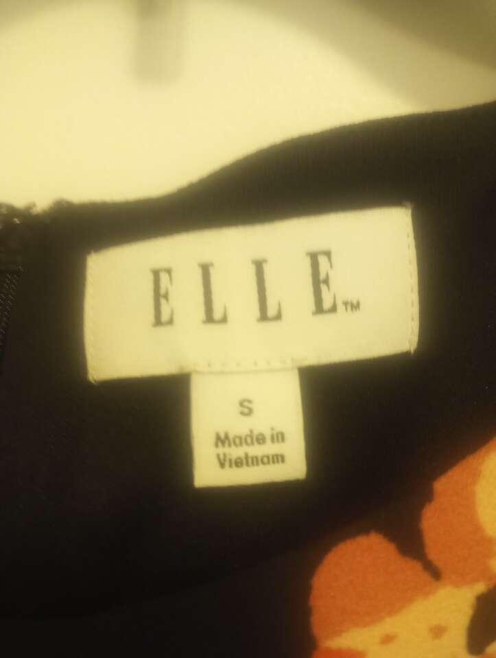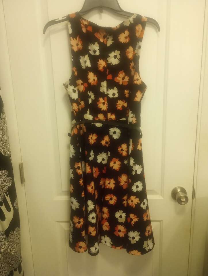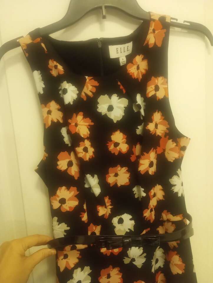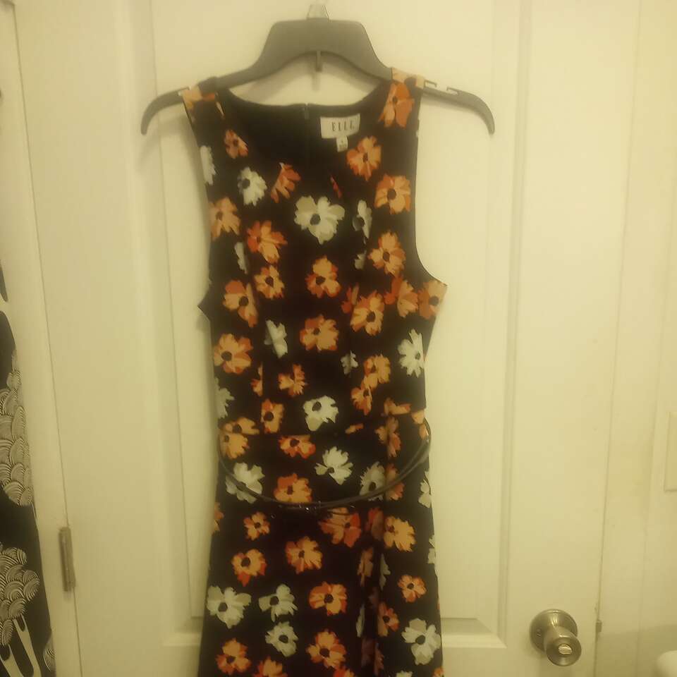 VenmoLike-New, very pretty, floral sleeveless dress by Elle, in size Small. Comes with shiny black belt w/a bow. Black with pink and cream flowers. Has a zipper on the back. Like-New condition and from a pet and smoke-free home. $20 cash or Venmo. Will hold with Venmo. Material is 95% polyester, 5% spandex. Text if interested or if you have any questions.