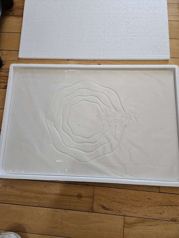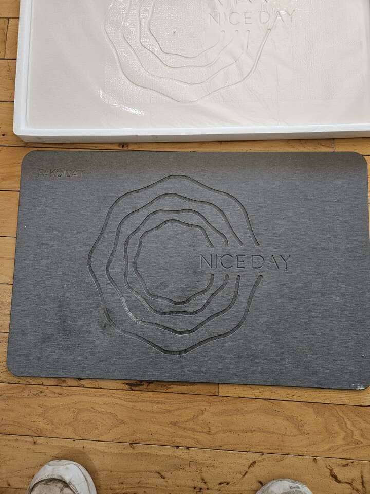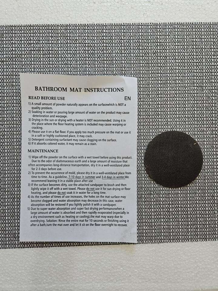 Fakoidat brand. 100% Diatomaceous earth stone bath mat. Non slip. Dries fast. comes with instructions and a sanding pad. I have several. comes in gray or white. the gray one hae a few spots because i took that one out of my bathroom. but all others are brand new in the box