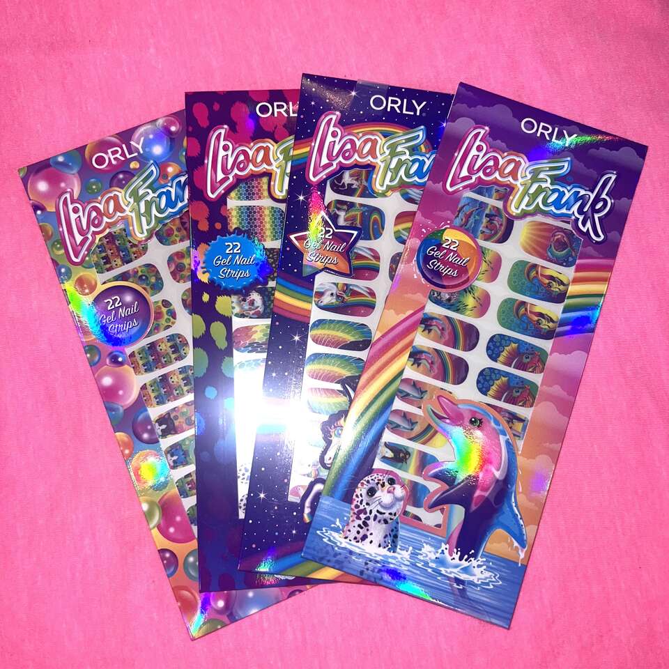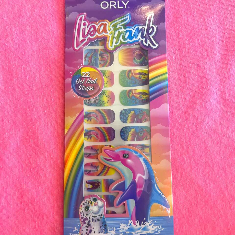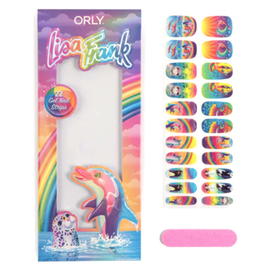 Dancing Dolphins™ and their friends are taking your nails to a rainbow paradise. ORLY x Lisa Frank Gel Nail Strips are the perfect way to bring art into your everyday style. Instant nail art for your nails featuring original art from Lisa Frank. Long Lasting Quick application & easy removal. No LED/UV light or special tools required. Non-damaging adhesive, safe for natural nails.