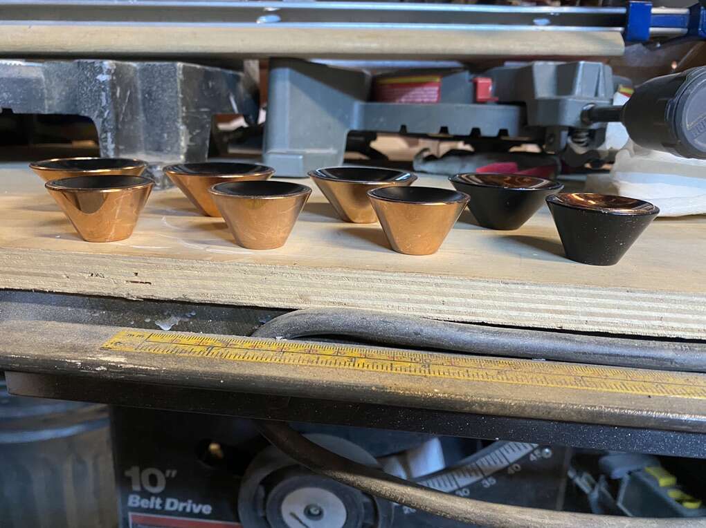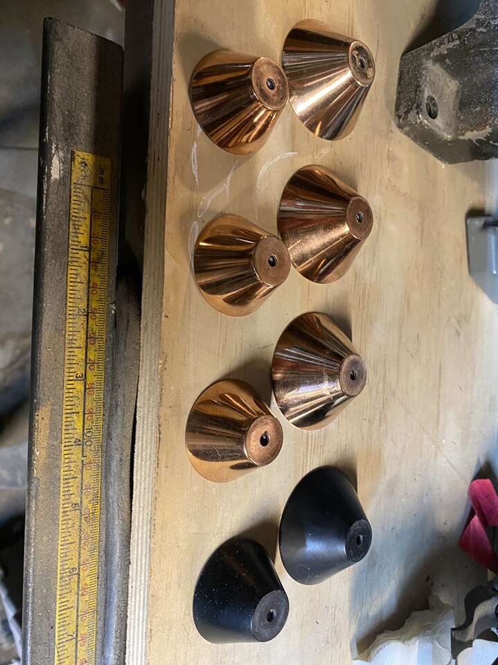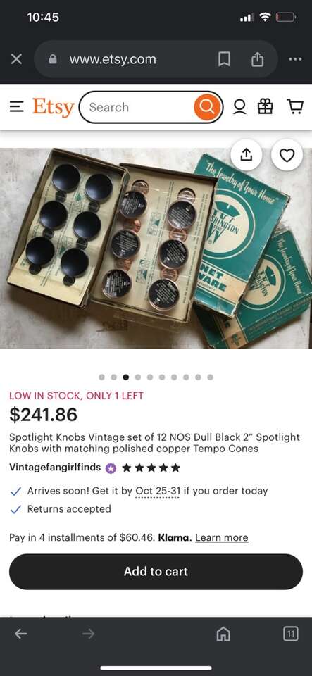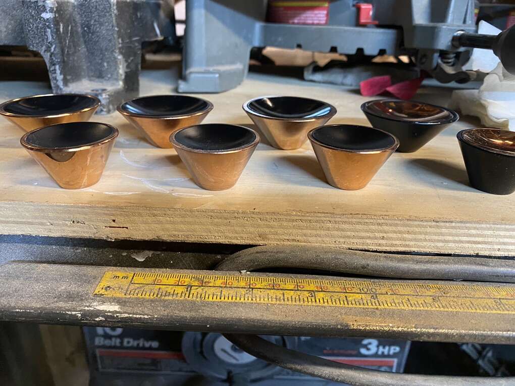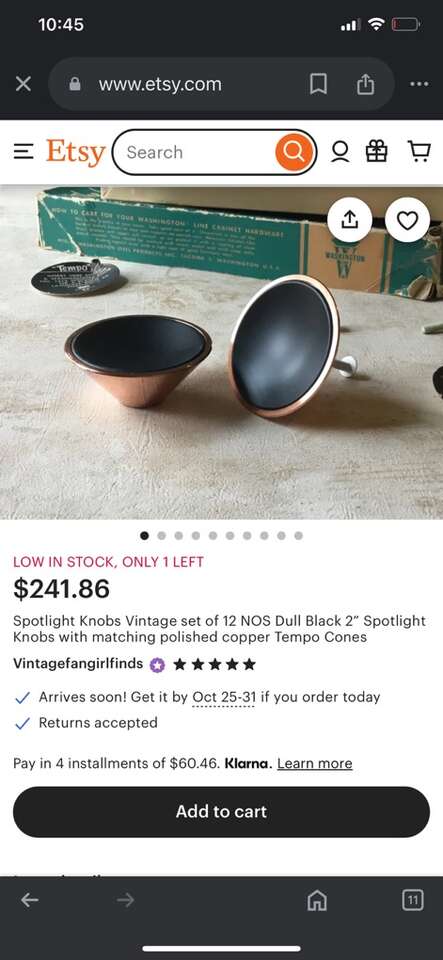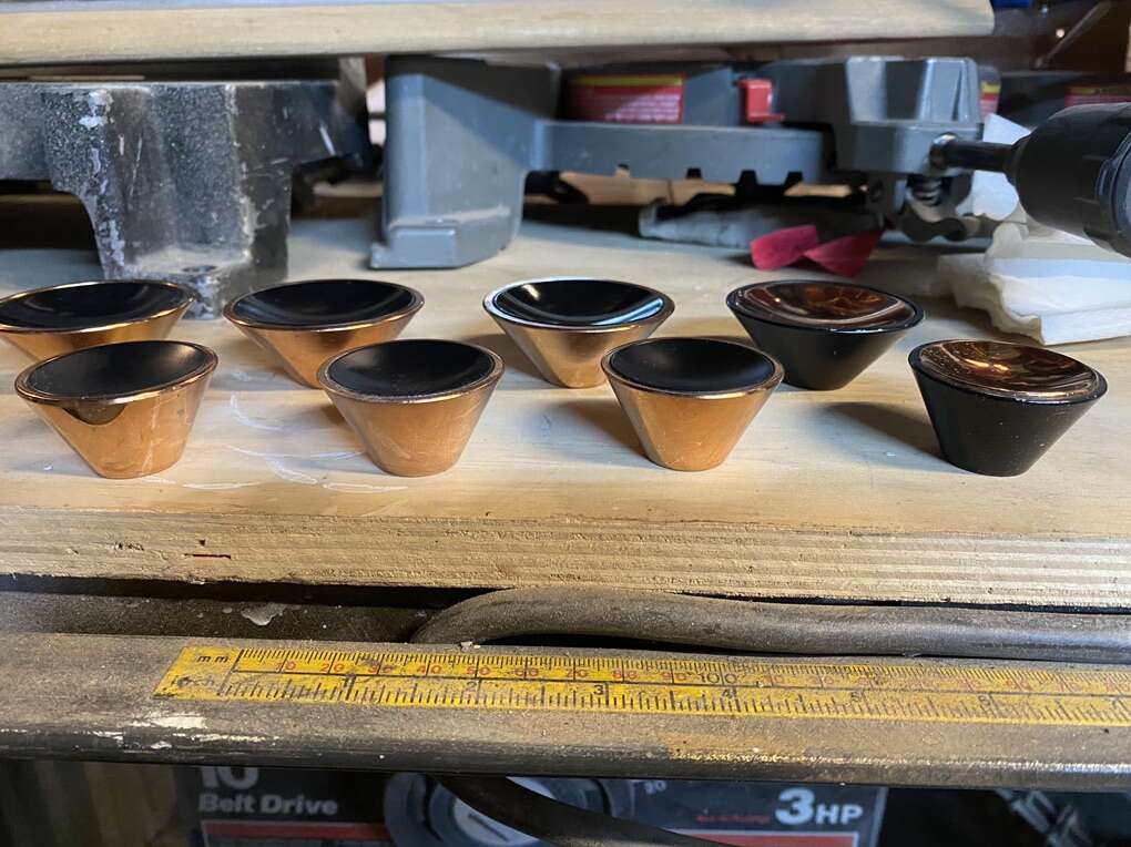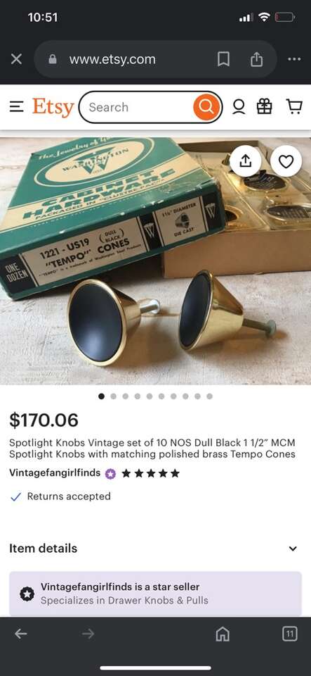 Rare Find! Set of 8. 4-2” & 4-1.5”Mid Century Modern dull black spotlight cabinet knobs with matching polished brass tempo cones. Please note the opposite for each size.