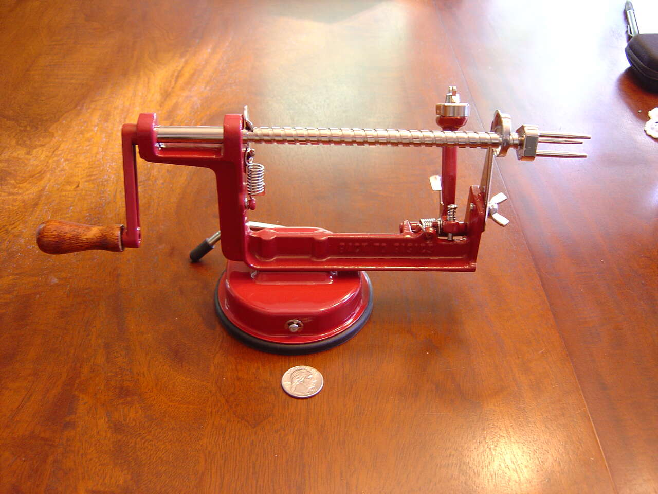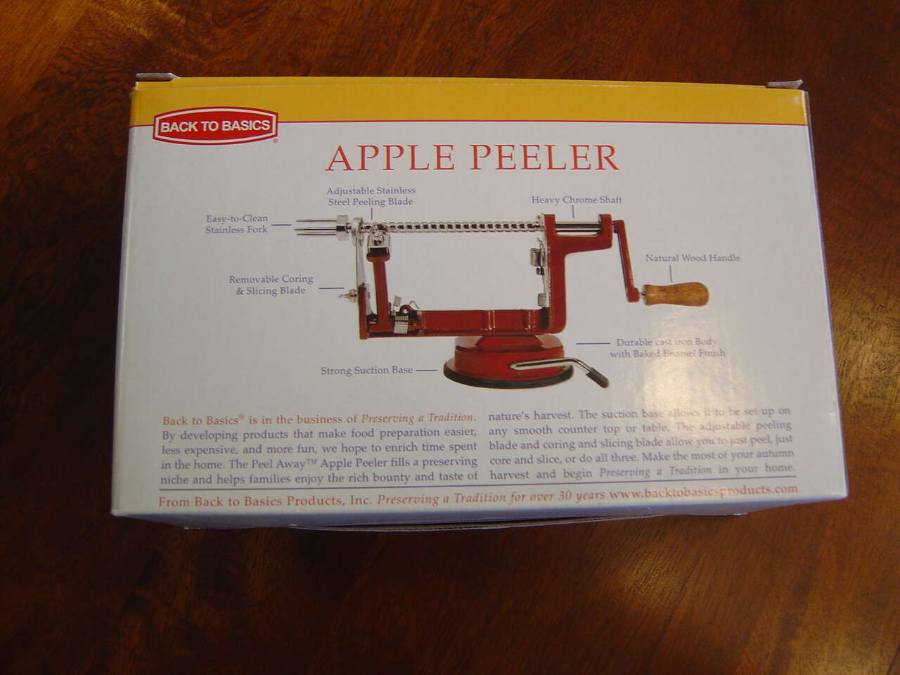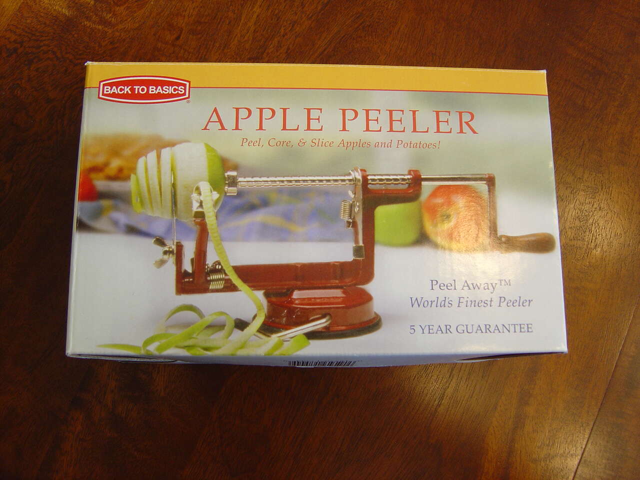 PayPalBack to Basics A505 Apple/Potato Peeler peels, cores and slices both Apples & Pototoes! Die Cast Iron body w/Baked Enamel Finish Strong Suction Base Easy to clean stainless fork Removable Coring & Slicing Blade Adjustable Stainless Steel Peeling Blade Heavy Chrome Shaft Natural Wood Handle Instructions Included