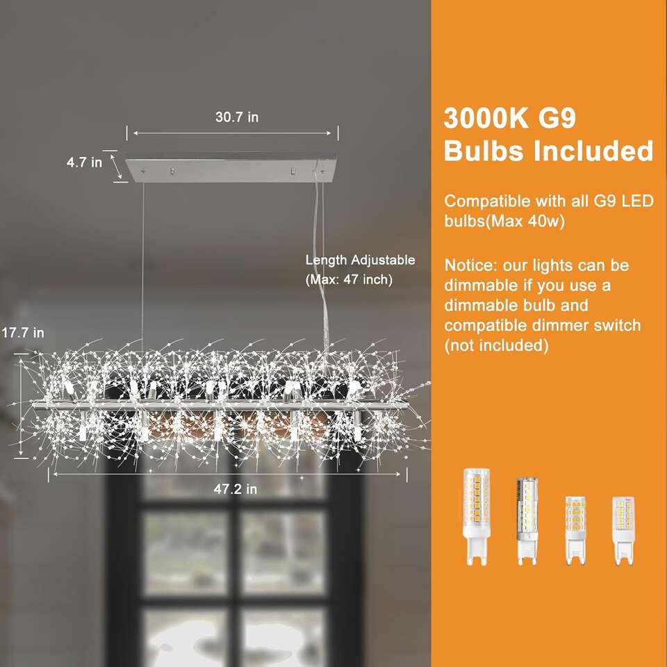PayPalBrand new, still in the box Retailer's Price:$199.99 My Price:$100.00 Retailer's Title: Depuley 47.2" Modern Silver Crystal Firework Chandelier, 15-Light Crystal Light Fixture Hanging, Linear Dandelion Chandelier, Sputnik Ceiling Pendant Light Fixtures for Dining Room(G9 Bulbs Included) Retailer's Website: https://a.co/d/gSDxPtG Retailer's Description: About this item Size & Adjustable Chain Dimension: Length 47.2" x Height 64.7". Max adjustable chain length: 47". You can change the length of the chain to easily adapt to different spaces in your home. Bulbs IncludedThis firework adjustable chandeliers have 15 light sources. Using an G9 base bulb, maximum wattage: 40W (3000K Bulbs Included). When using 3 colors light bulbs can freely change 3 color temperature. Multiple Applicable Scenarios In addition to flat roofs, the silvery chandelier can also be installed on arched or sloping roofs. You can place it in such as dining rooms, living rooms, bedrooms, foyers, kitchens, etc. Crystal Beads Nano-cutting crystal beads, smooth and shiny, as well as splatter the sunshine into rainbows. When the lighting hits the crystal beads, they cast hundreds of rainbow prisms in the air. The high quality of the mental frame can ensure the construction of the linear chandeliers is more durable and anti-rust, easy to clean and maintain. Best Service We value customer experience. If you have any questions about the crystal firework chandelier, we will solve them for you as soon as possible. Features & Specs Wattage40 wattsBulb BaseG9Controller TypePush ButtonSwitch TypePush ButtonMounting TypeCeiling MountFixture TypeNon RemovableControl MethodAppNumber of Light Sources15Voltage120 VoltsLight Colorwarm whiteEmbellishment FeatureCrystalRoom TypeLiving Room, Bedroom, Dining RoomSpecific Uses For ProductIndoor use onlyIndoor Outdoor UsageIndoorPower SourceACAdditional FeaturesAdjustable Chain, Included G9 Bulbs with 3000K Color Temperature, Rainbow-prism Crystal Beads Lot 67 9 25 24 2500