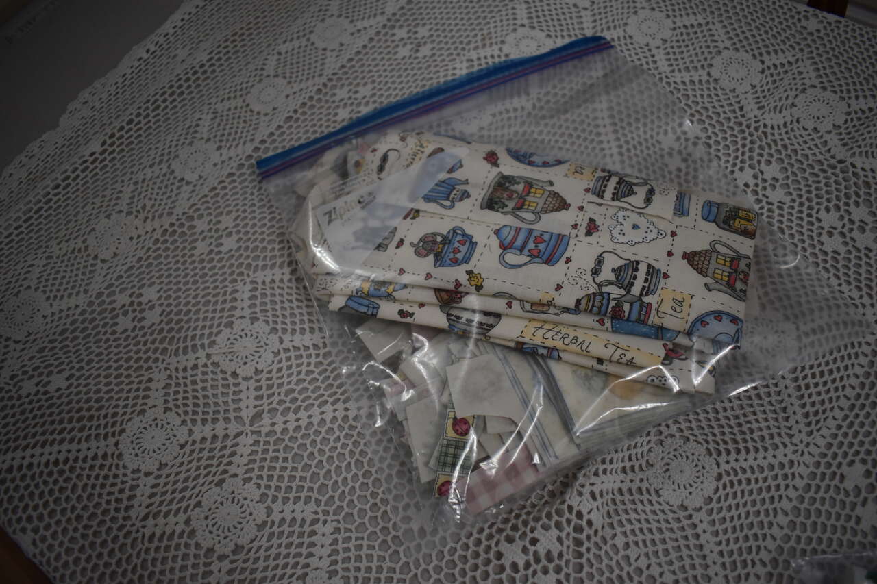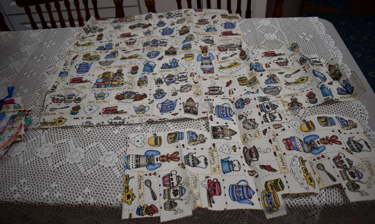 IT MEASURES… One of the 2 Pieces that have been cut into Measures Approx. 19 inches X 20 1/2 inches with another 9 inch X 8 3/4 inch piece attached the larger one. And the other cut piece measures… Approx 18 3/4 inches X 7 inches. THEN THERE IS THE BAGGIE THAT IS FILLED WITH OVER 100 ALREADY CUT FABRIC PIECES.
