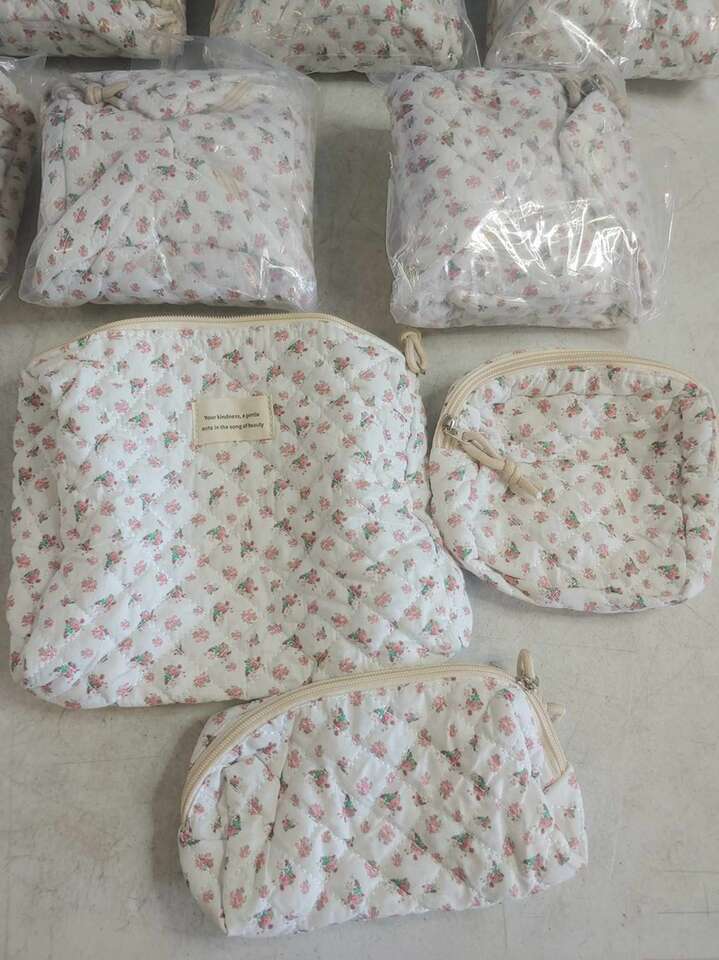 Travel Cosmetic Makeup Bags for Women (4 Pcs), Quilted Coquette Aesthetic Floral Toiletry Organizer Bag – White w/ Red Roses.