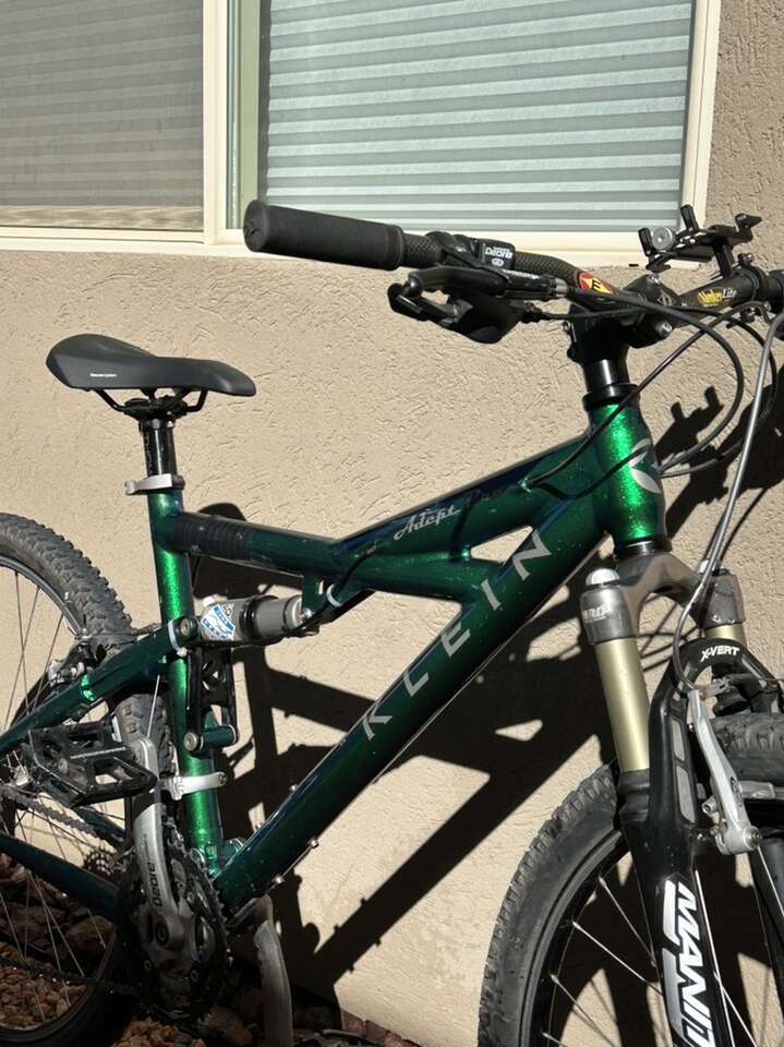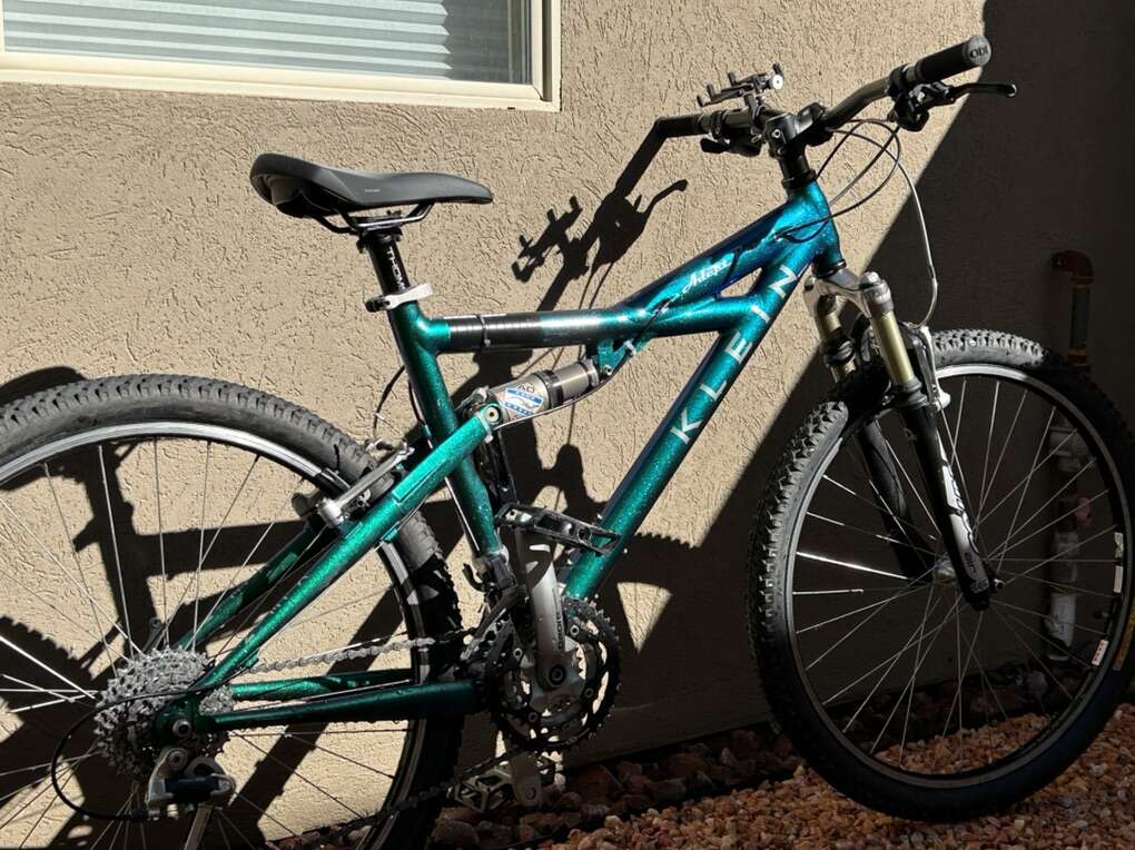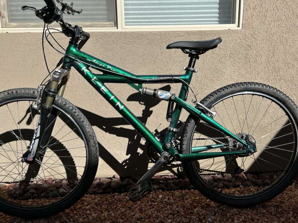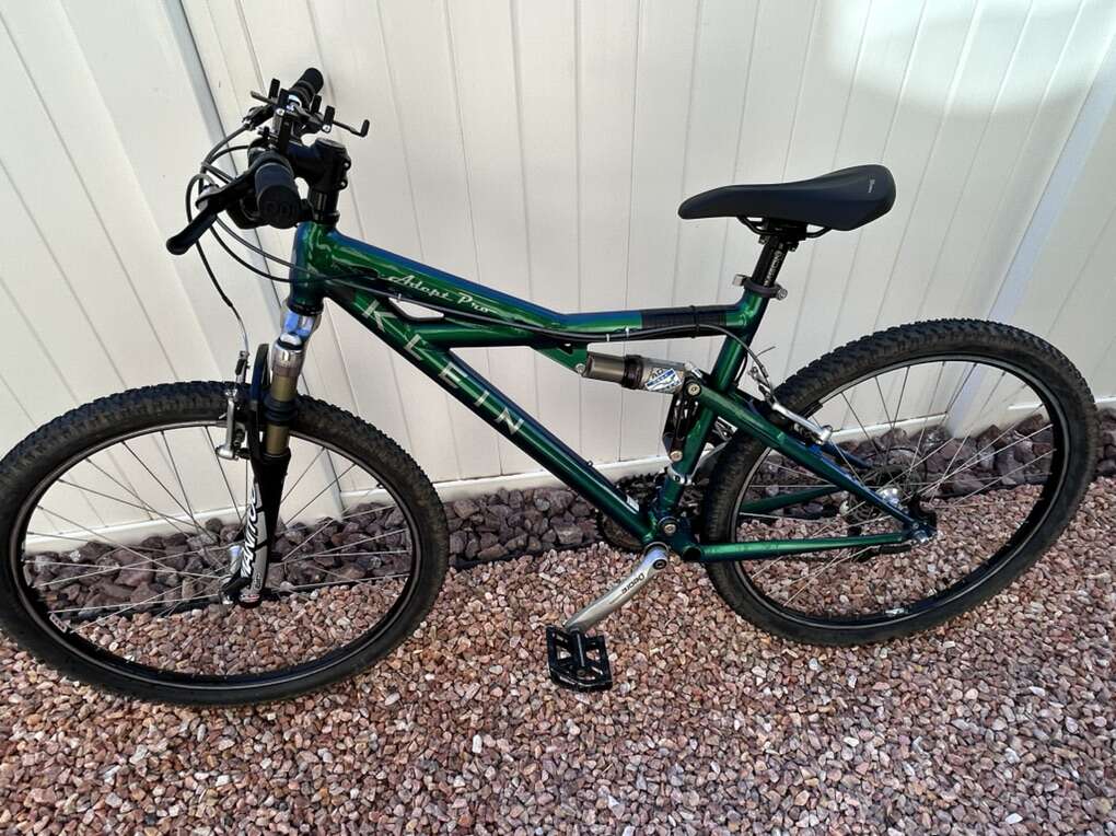Klein Adept Pro full suspension bike for sale. Custom built with two-toned paint in Seattle in ‘97. I inherited it this month from my uncle who used it for both city commute and trails. Ridden on paved trails a few times, and it is very comfortable. Very fun on trails with the full suspension! Currently has hydraulic brakes but it does have the brackets in place to allow for converting to disc brakes. I have multiple bikes and simply dont need this one in addition.