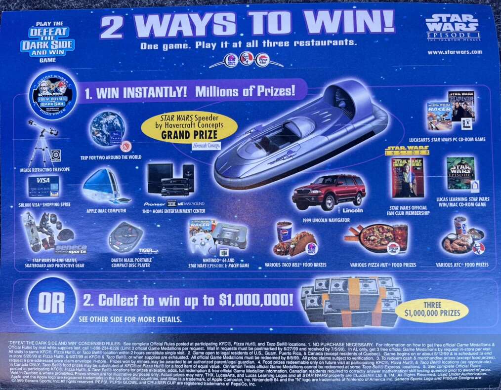 Game sheet KFC/Taco Bell/Pizza Hut Star Wars Episode 1 Defeat the Dark Side Great shape and never used. See pictures for details.