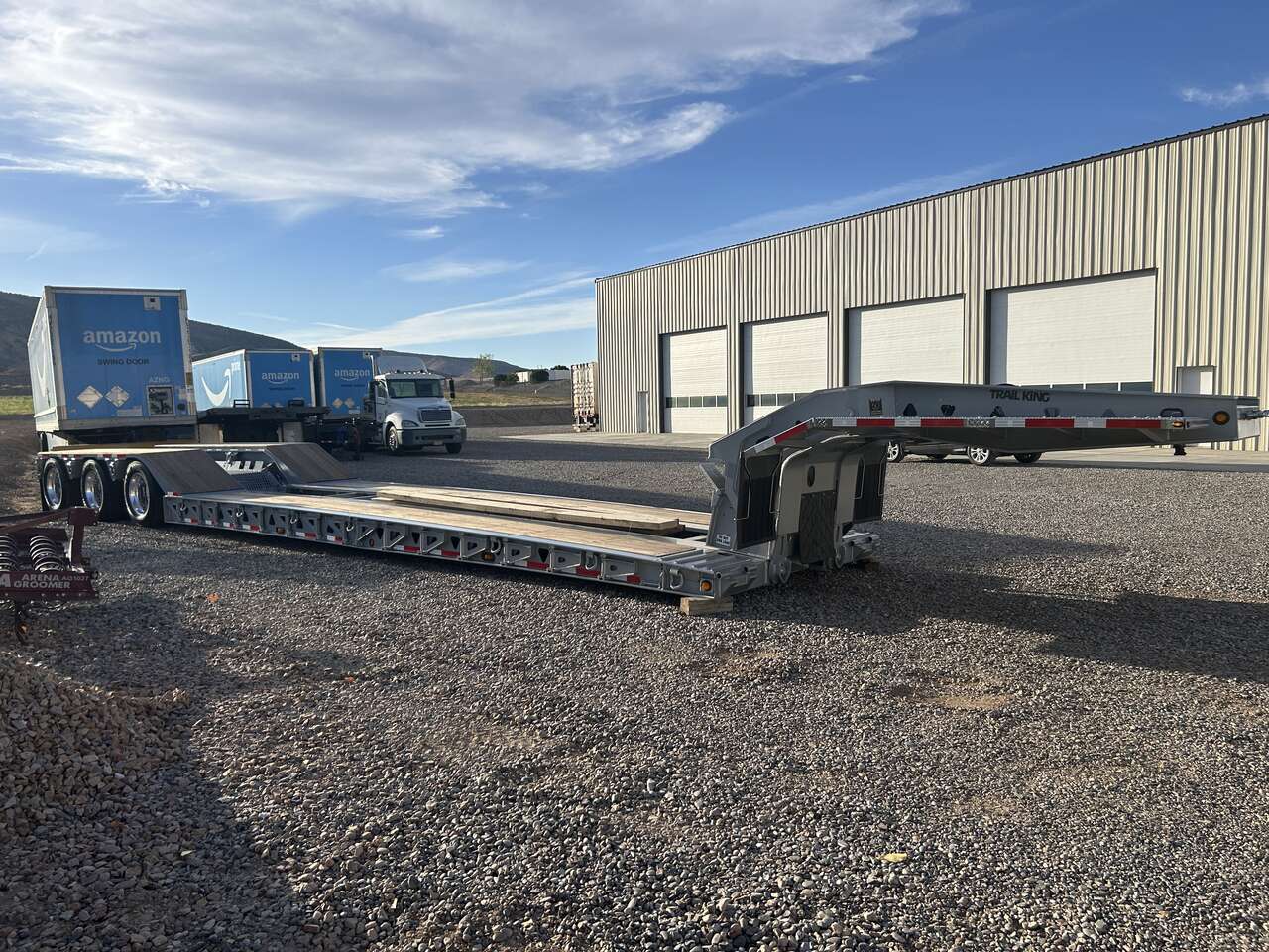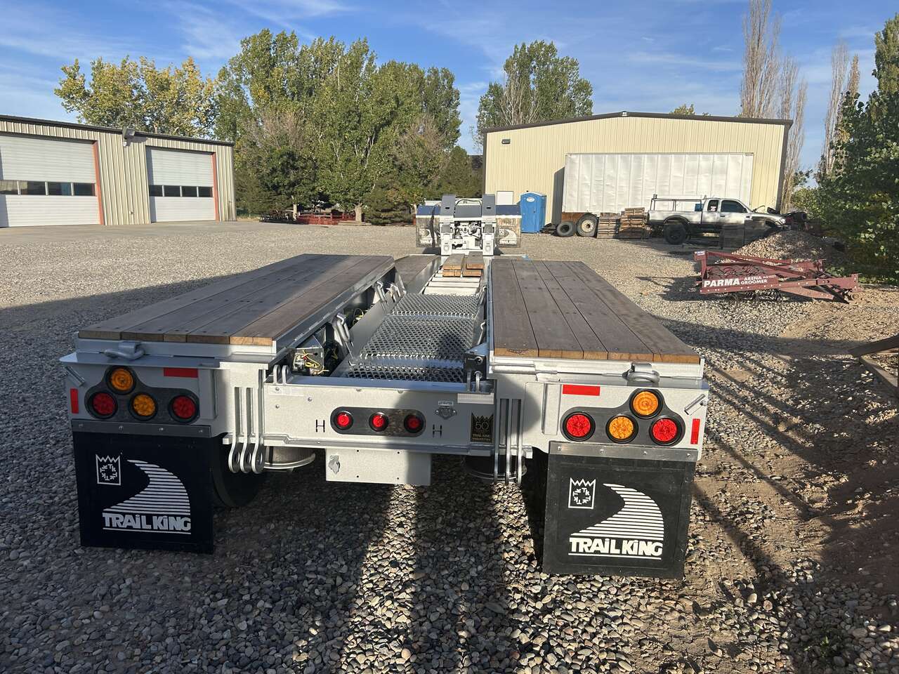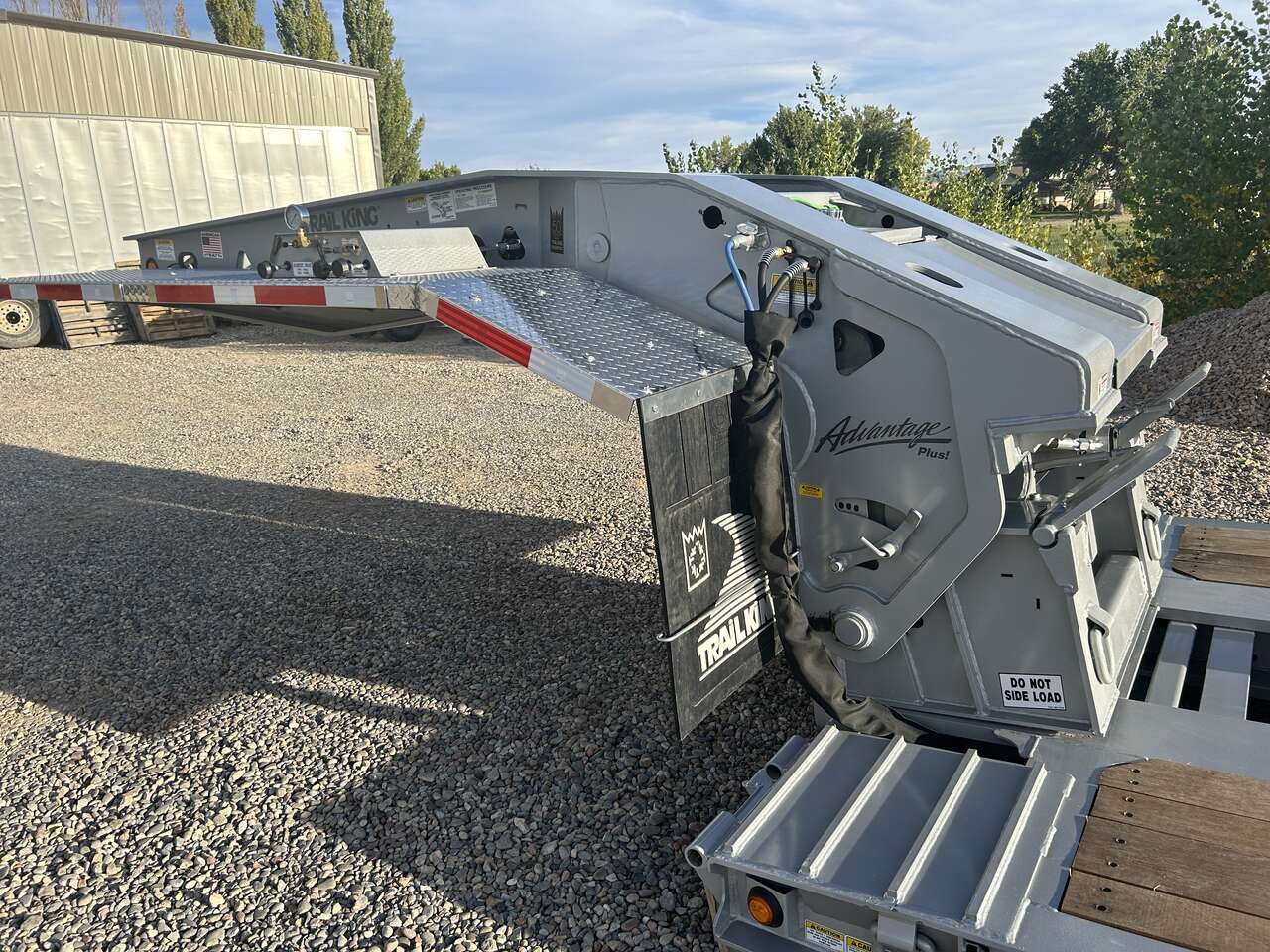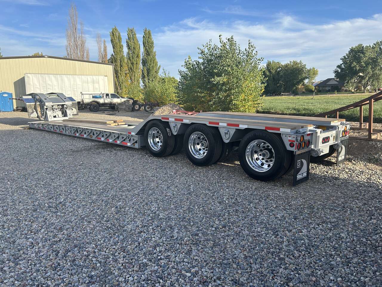 New 2025 Trail King TK110HDG Advantage Plus 55 Ton RGN Paver Special Lowboy, 56' x 108", 16" and 40" king pin settings with 110" and 86" swing, 389cc Honda self contained hydraulics, 65 ton HD gooseneck 5 position height, hydraulic T-bar gooseneck support arm, arched gooseneck for increased truck fender clearance, aluminum diamond plate 13' gooseneck fenders, 6" ground clearance 18" deck height, 25'9" well, knuckle trough covered with 1/4" steel and heavy duty expanded metal bolted in boom trough, load bearing 26 degree slope covered with 1 3/8" Apitong 60" wheel spacings, Alcoa Durabrite polished aluminum wheels, Stemco grit-guard hub seals, 1 3/4" Apitong raised decking, 22 D-ring tiedowns, 30 swingout out riggers with planks, amber strobes at rear, first axle chain up with air shutoffs, front and rear flag holders, remote flasher with battery backup, grey metallic paint with white decals, bridge lock decking screws, stainless around lights in tail channel, front ramps, Airway per axle scales, 4th flip axle, booster, or stinger ready. Build sheets available upon request. FET has been paid and is included in the price of $141,900.00 - Trailer is located near Grand Junction, Colorado