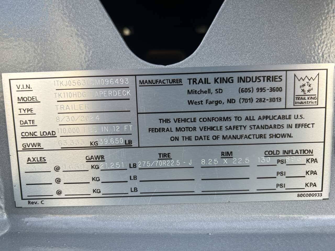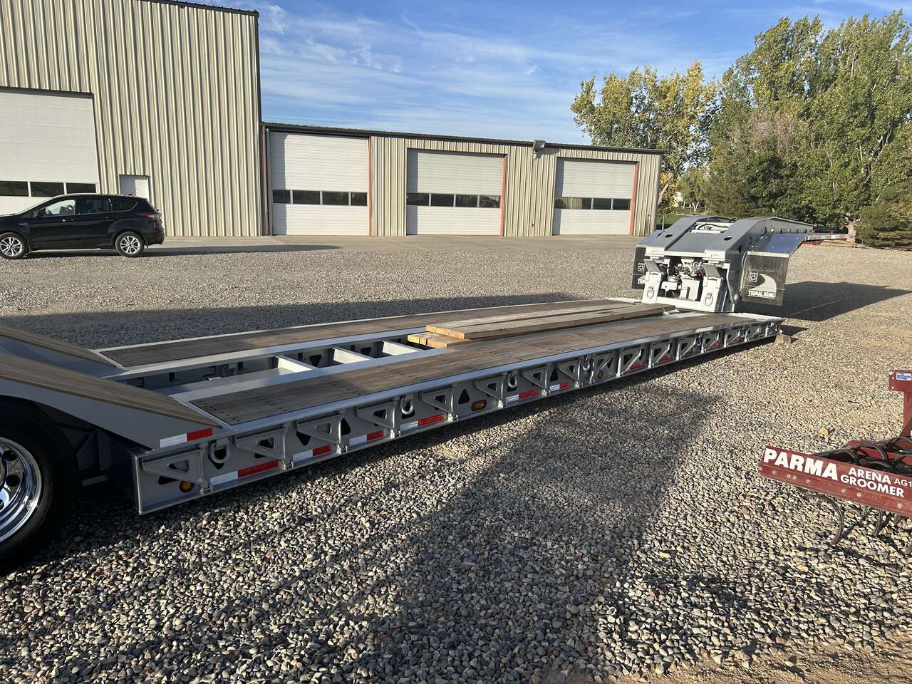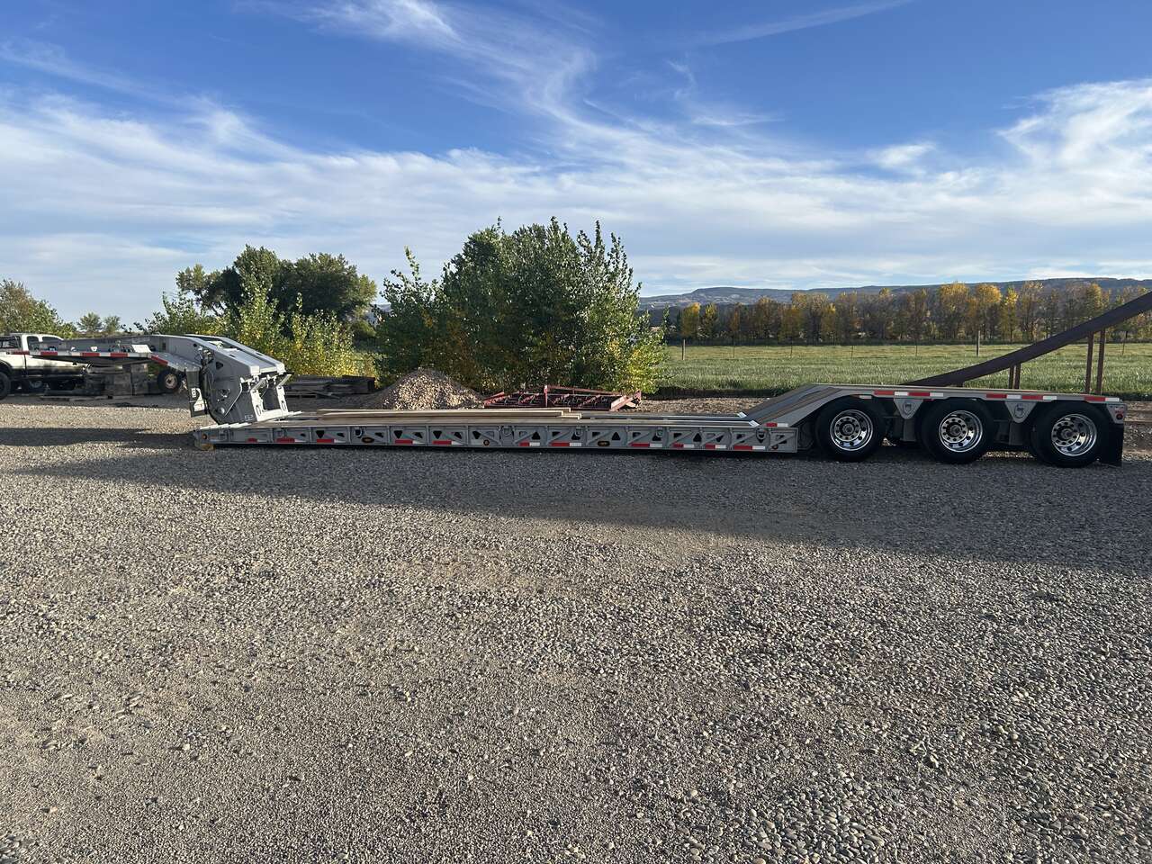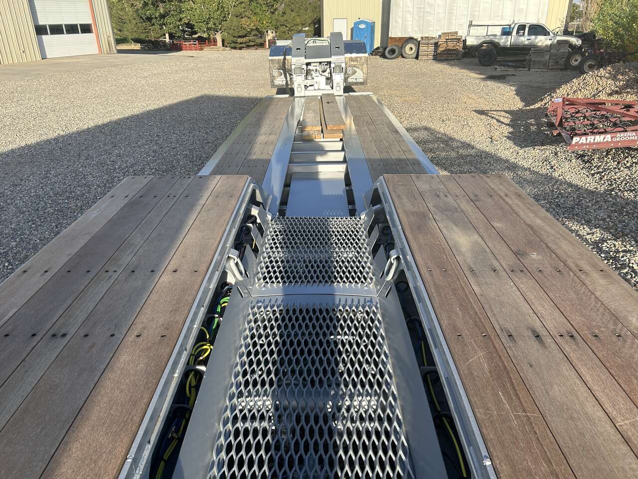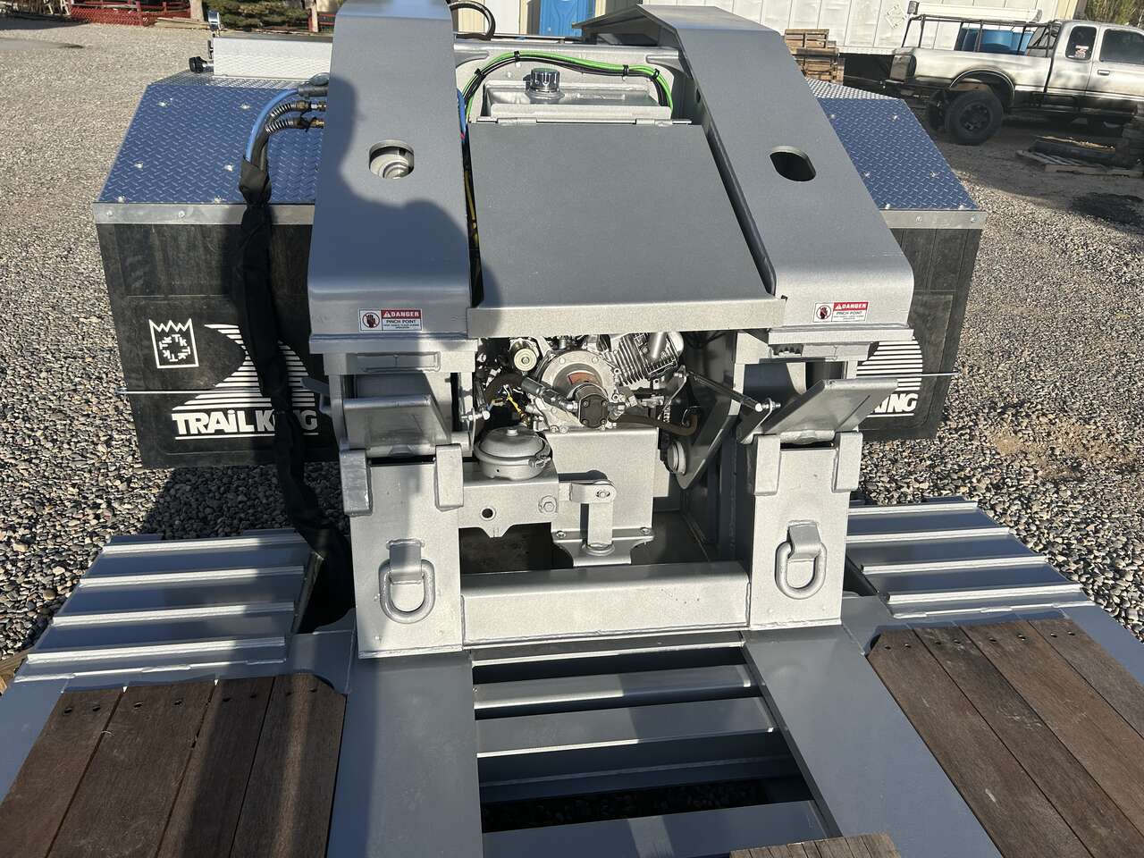 New 2025 Trail King TK110HDG Advantage Plus 55 Ton RGN Paver Special Lowboy, 56' x 108", 16" and 40" king pin settings with 110" and 86" swing, 389cc Honda self contained hydraulics, 65 ton HD gooseneck 5 position height, hydraulic T-bar gooseneck support arm, arched gooseneck for increased truck fender clearance, aluminum diamond plate 13' gooseneck fenders, 6" ground clearance 18" deck height, 25'9" well, knuckle trough covered with 1/4" steel and heavy duty expanded metal bolted in boom trough, load bearing 26 degree slope covered with 1 3/8" Apitong 60" wheel spacings, Alcoa Durabrite polished aluminum wheels, Stemco grit-guard hub seals, 1 3/4" Apitong raised decking, 22 D-ring tiedowns, 30 swingout out riggers with planks, amber strobes at rear, first axle chain up with air shutoffs, front and rear flag holders, remote flasher with battery backup, grey metallic paint with white decals, bridge lock decking screws, stainless around lights in tail channel, front ramps, Airway per axle scales, 4th flip axle, booster, or stinger ready. Build sheets available upon request. FET has been paid and is included in the price of $141,900.00 - Trailer is located near Grand Junction, Colorado