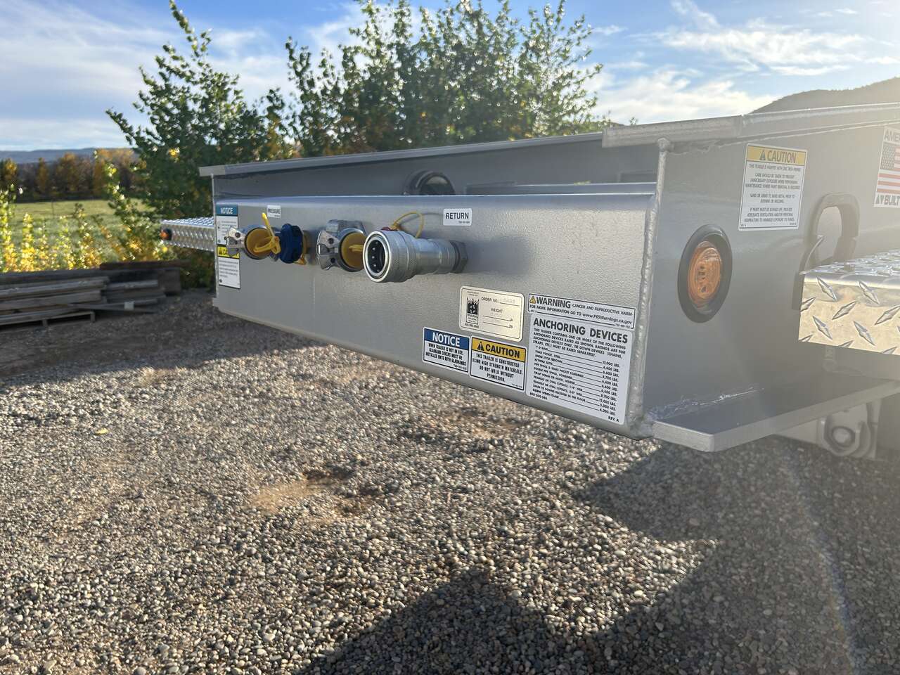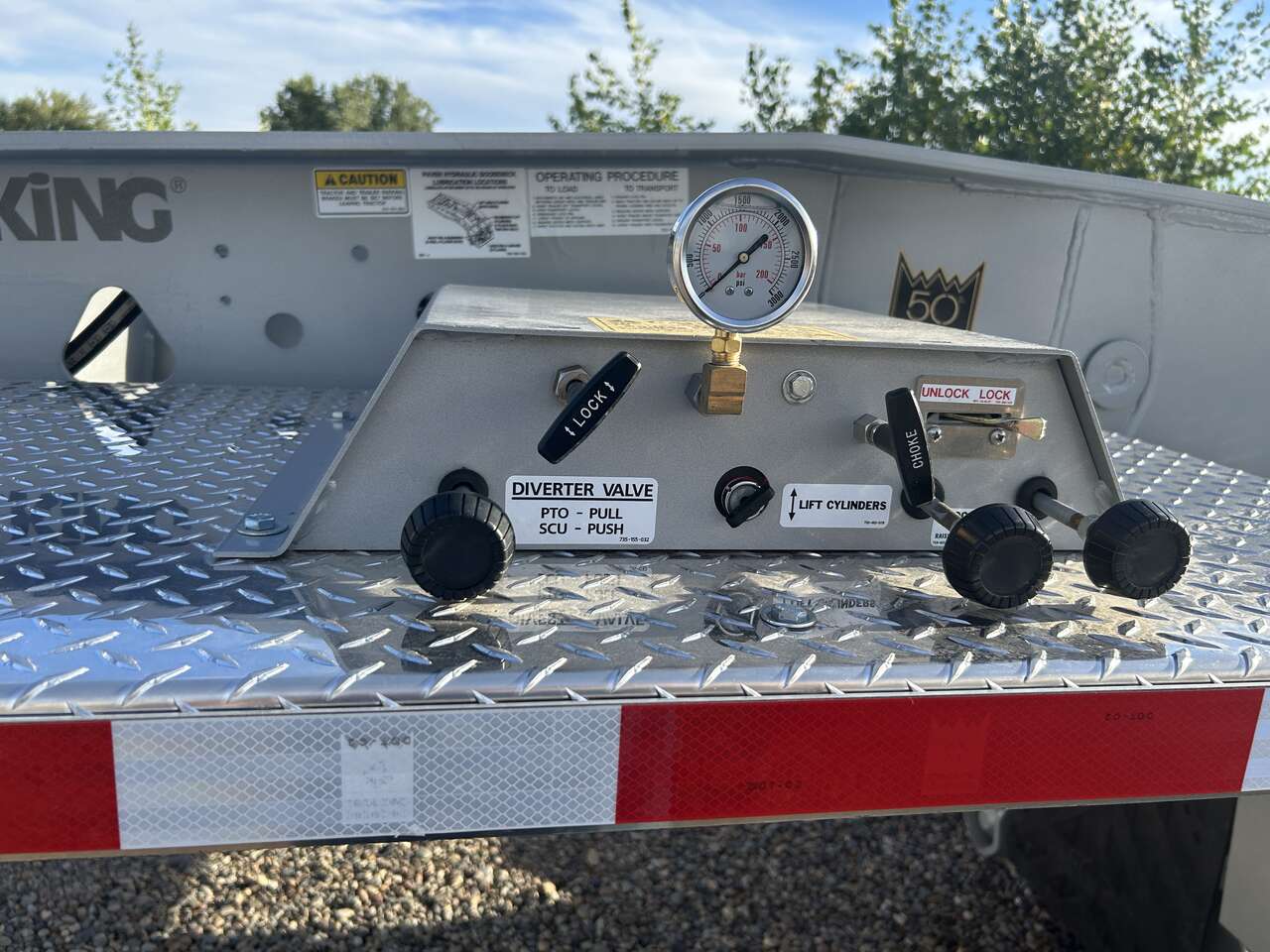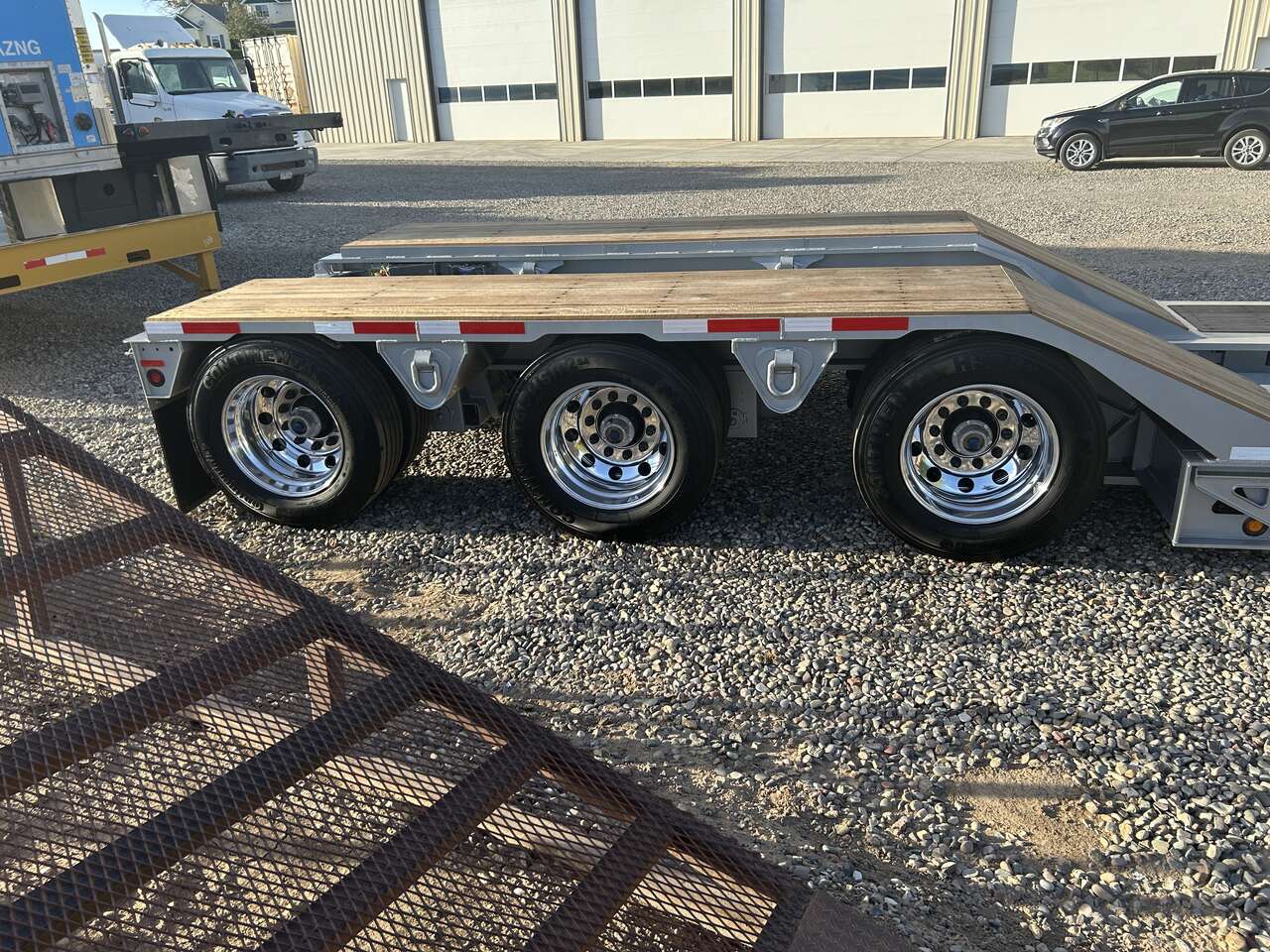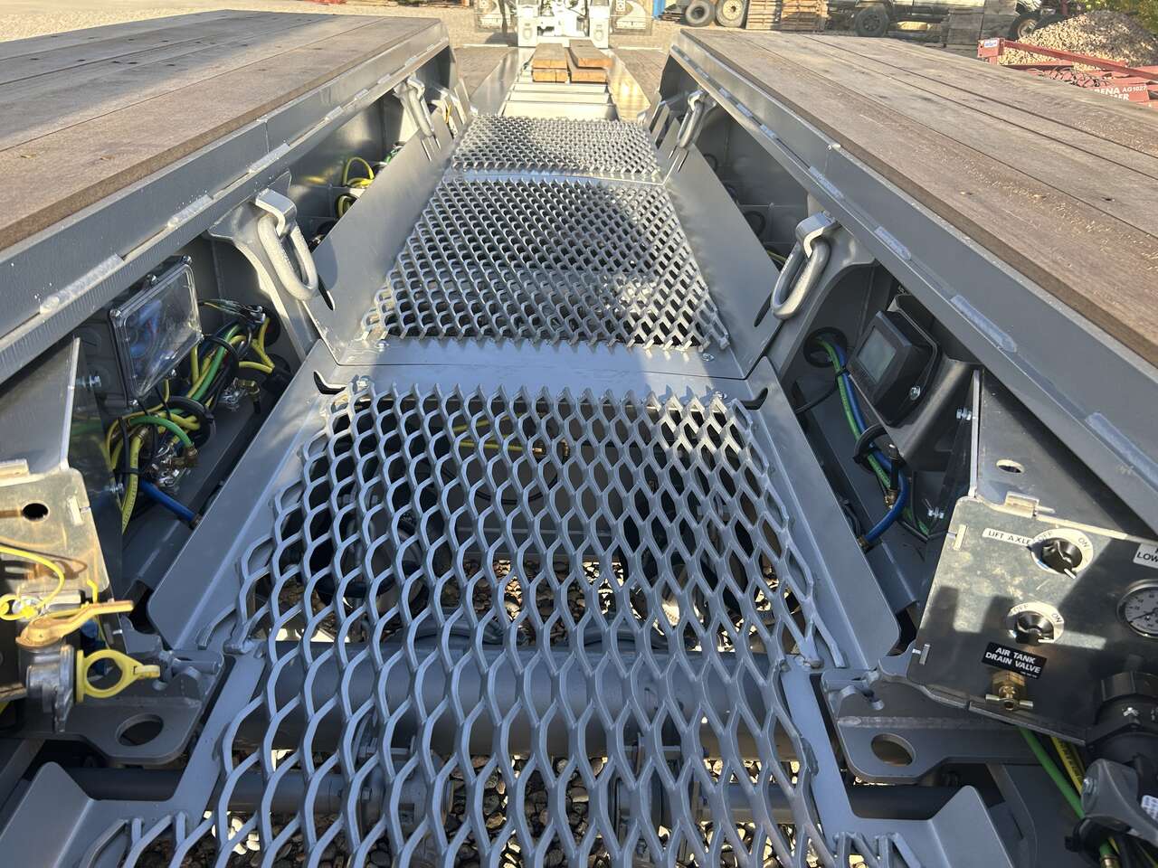 New 2025 Trail King TK110HDG Advantage Plus 55 Ton RGN Paver Special Lowboy, 56' x 108", 16" and 40" king pin settings with 110" and 86" swing, 389cc Honda self contained hydraulics, 65 ton HD gooseneck 5 position height, hydraulic T-bar gooseneck support arm, arched gooseneck for increased truck fender clearance, aluminum diamond plate 13' gooseneck fenders, 6" ground clearance 18" deck height, 25'9" well, knuckle trough covered with 1/4" steel and heavy duty expanded metal bolted in boom trough, load bearing 26 degree slope covered with 1 3/8" Apitong 60" wheel spacings, Alcoa Durabrite polished aluminum wheels, Stemco grit-guard hub seals, 1 3/4" Apitong raised decking, 22 D-ring tiedowns, 30 swingout out riggers with planks, amber strobes at rear, first axle chain up with air shutoffs, front and rear flag holders, remote flasher with battery backup, grey metallic paint with white decals, bridge lock decking screws, stainless around lights in tail channel, front ramps, Airway per axle scales, 4th flip axle, booster, or stinger ready. Build sheets available upon request. FET has been paid and is included in the price of $141,900.00 - Trailer is located near Grand Junction, Colorado