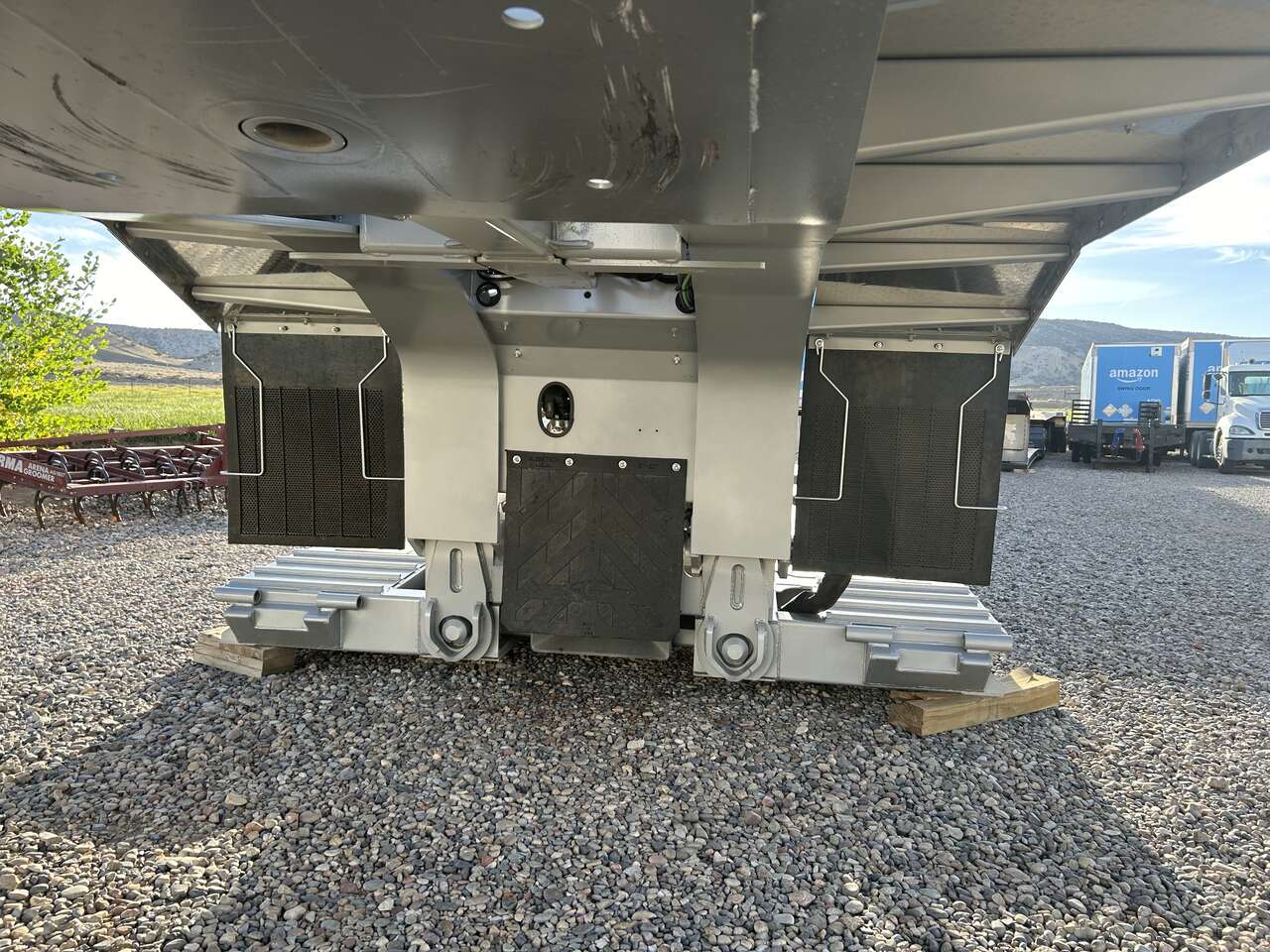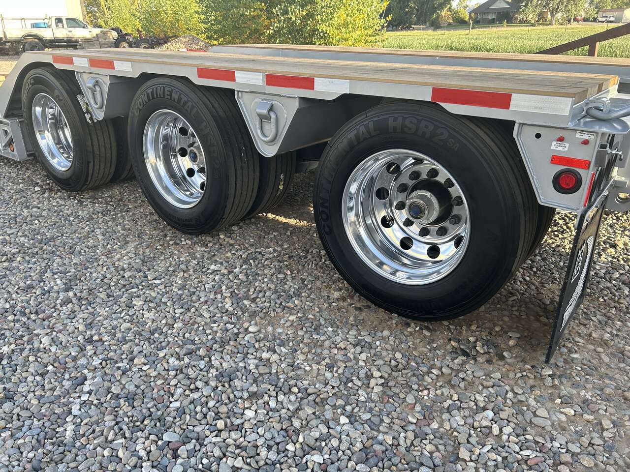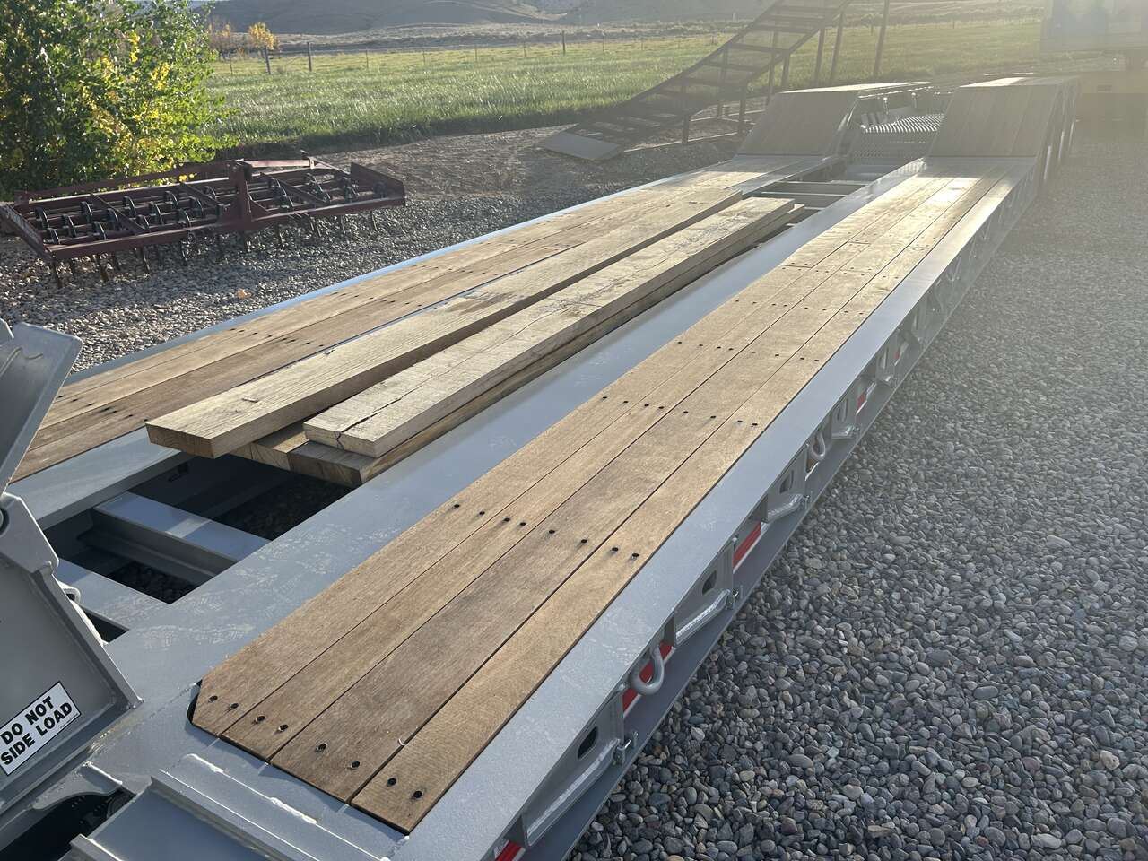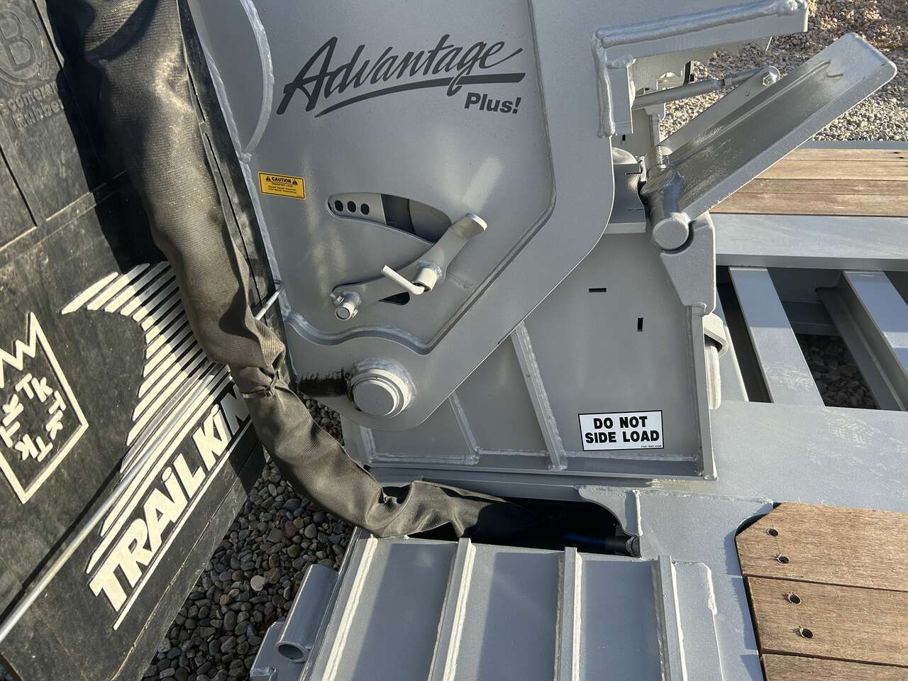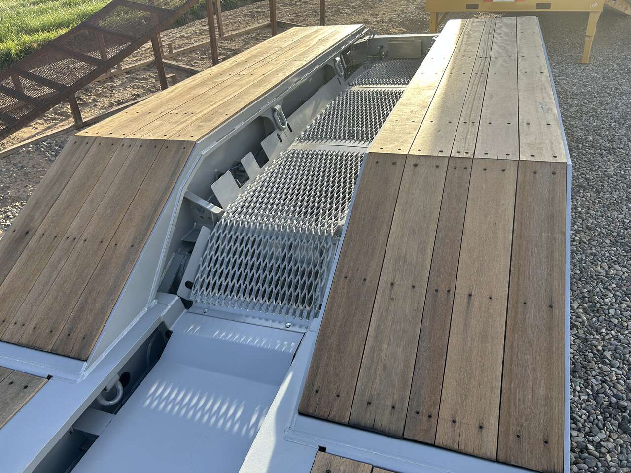 New 2025 Trail King TK110HDG Advantage Plus 55 Ton RGN Paver Special Lowboy, 56' x 108", 16" and 40" king pin settings with 110" and 86" swing, 389cc Honda self contained hydraulics, 65 ton HD gooseneck 5 position height, hydraulic T-bar gooseneck support arm, arched gooseneck for increased truck fender clearance, aluminum diamond plate 13' gooseneck fenders, 6" ground clearance 18" deck height, 25'9" well, knuckle trough covered with 1/4" steel and heavy duty expanded metal bolted in boom trough, load bearing 26 degree slope covered with 1 3/8" Apitong 60" wheel spacings, Alcoa Durabrite polished aluminum wheels, Stemco grit-guard hub seals, 1 3/4" Apitong raised decking, 22 D-ring tiedowns, 30 swingout out riggers with planks, amber strobes at rear, first axle chain up with air shutoffs, front and rear flag holders, remote flasher with battery backup, grey metallic paint with white decals, bridge lock decking screws, stainless around lights in tail channel, front ramps, Airway per axle scales, 4th flip axle, booster, or stinger ready. Build sheets available upon request. FET has been paid and is included in the price of $141,900.00 - Trailer is located near Grand Junction, Colorado