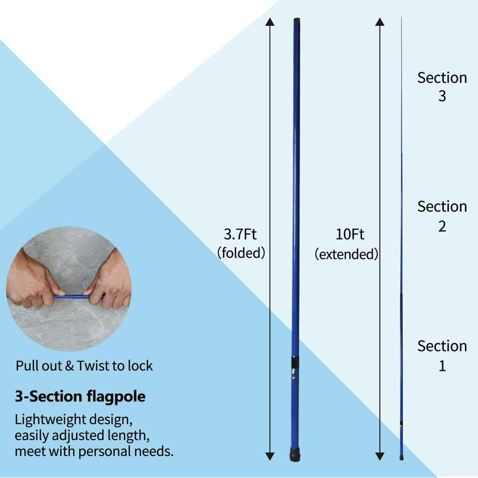 Premium quality - Lightweight fiberglass withstands almost all conditions you can't miss this durable handy telescopic flagpole for your flag Pragmatic design - Smart twist-locking design for Easy installation and storage. No slipping concerns with the firmly lock at each section. Ideal for outdoor use. Fly proudly - Like a flexible fishing rod so it withstands wind compact. Ideal for windsocks and flags allow the flag fly freedom without the concerns of tangling. Specification - Each package contains 1 Anley outdoor telescoping flagpole in color blue. The pole is with a maximum extended height of 10ft.