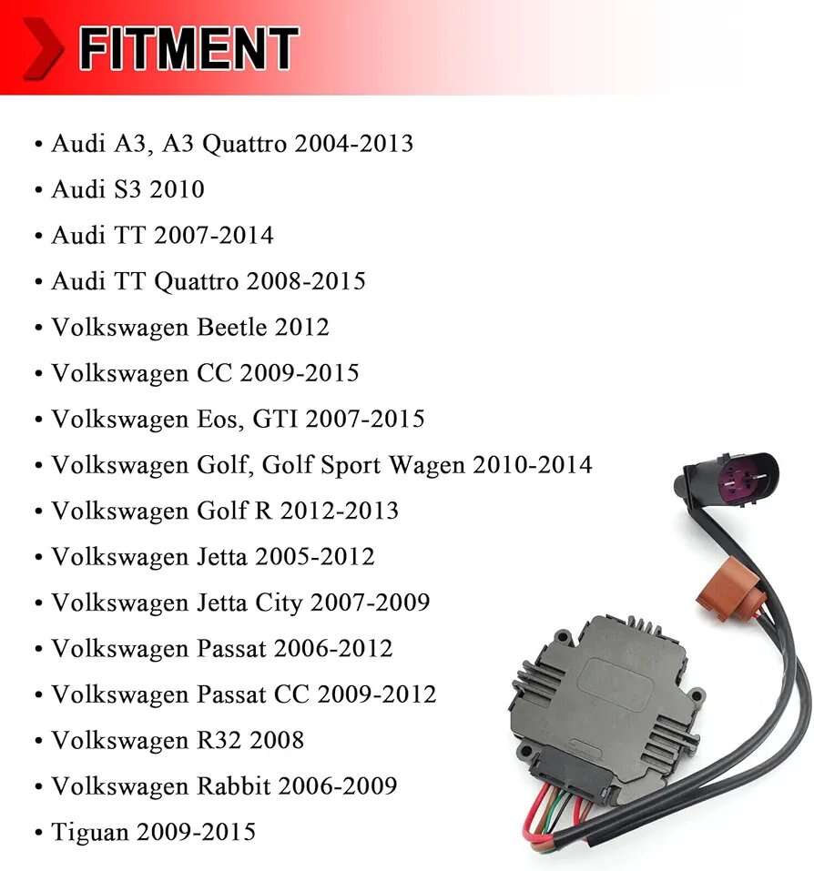 Brand New. In the box. 3C0959455F Engine Radiator Cooling Fan Control Module Fit For Audi A3 TT VW Beetle for Tiguan CC GTI Golf Jetta Passat, Replaces # 1K0959455FR, 3C0959455F Product details Top highlights REPLACES PART NUMBER: FCM109, 1K0959455FR, 3C0959455F. Compatibility is just for reference, please confirm your OE number. FITMENT: This cooling fan module Fit For Audi A3, A3 Quattro 2004-2013; S3 2010; TT 2007-2014; TT Quattro 2008-2015. FITMENT: Fit For Volkswagen Beetle 2012; CC 2009-2015; Eos, GTI 2007-2015; Golf, Golf SportWagen 2010-2014; Golf R 2012-2013; Jetta 2005-2012; Jetta City 2007-2009; Passat 2006-2012; Passat CC 2009-2012; R32 2008; Rabbit 2006-2009; for Tiguan 2009-2015. MATERIAL: Made of ABS plastic and metal, the metal is specially heated through high temperature, which is wear-resistant and corrosion-resistant, and has a long service life. FUNCTION: Control fan speed to minimize energy loss and maximize fuel economy. Keep the engine coolant within a constant temperature range.