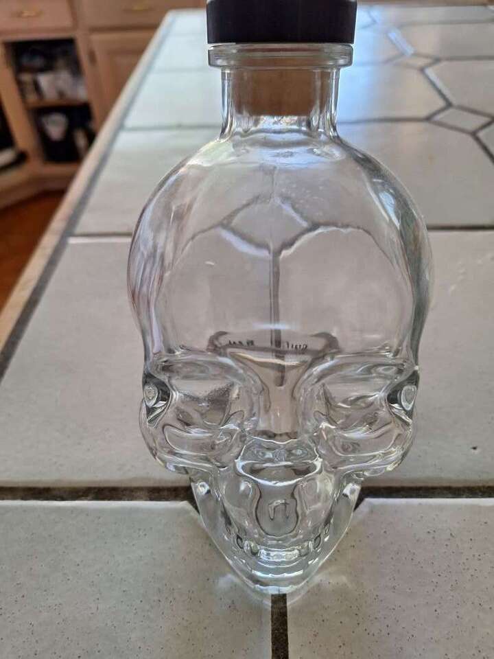 This is a Glass Skull decanter. Would be great as Halloween decor. Add lights and it will be a scary display. This Glass Skull was originally a decanter. Great for Collectors.