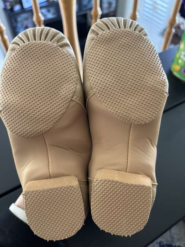 New tan jazz dancing shoes. They run small, so my daughter couldn’t use them. She’s a size 1. I’m guessing these would fit size 12 shoe. New off the website I paid $30.