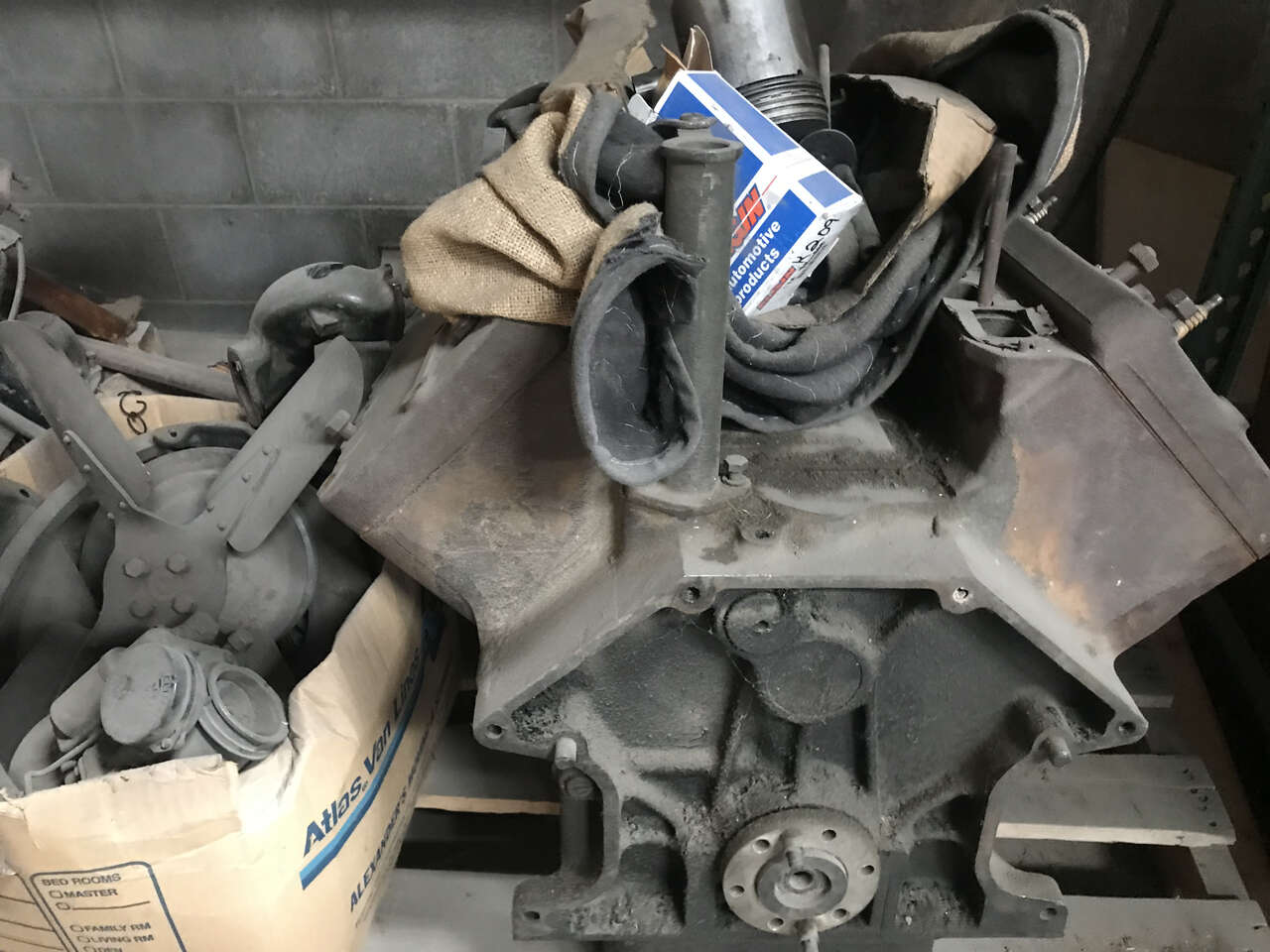 This collection of parts includes starter, generator, carburator with 3 intakes.