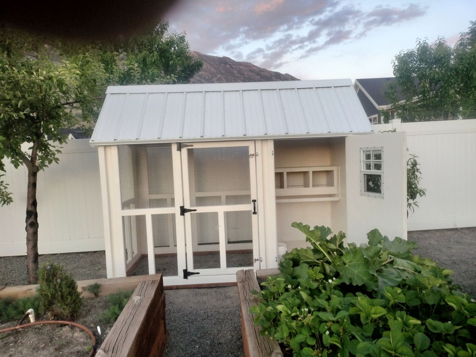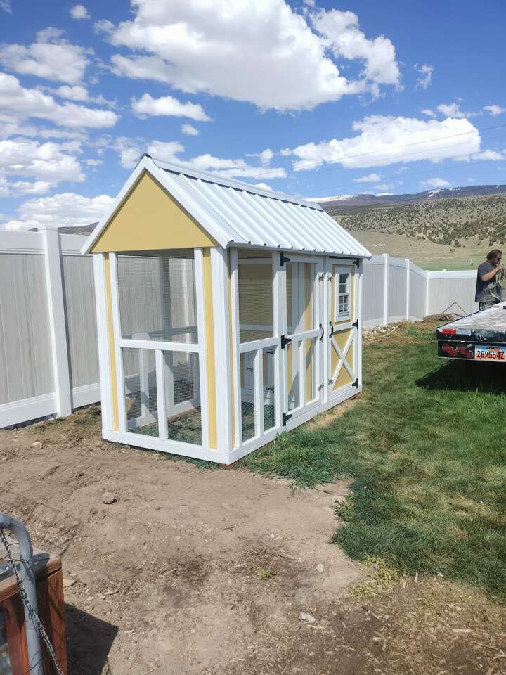 Venmochicken coop with run ..This is a great back yard coop that has its own run . Comes complete with 3 nesting boxes and roosting space for 10 chickens ..built on site paint included ! .your choice ..please text David at 801 649 8225.