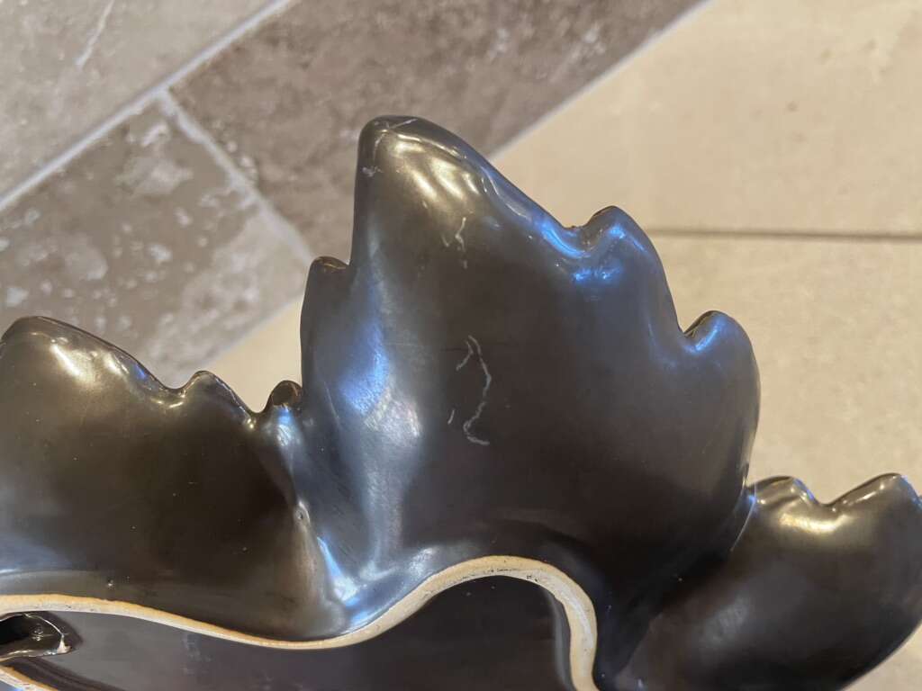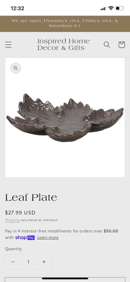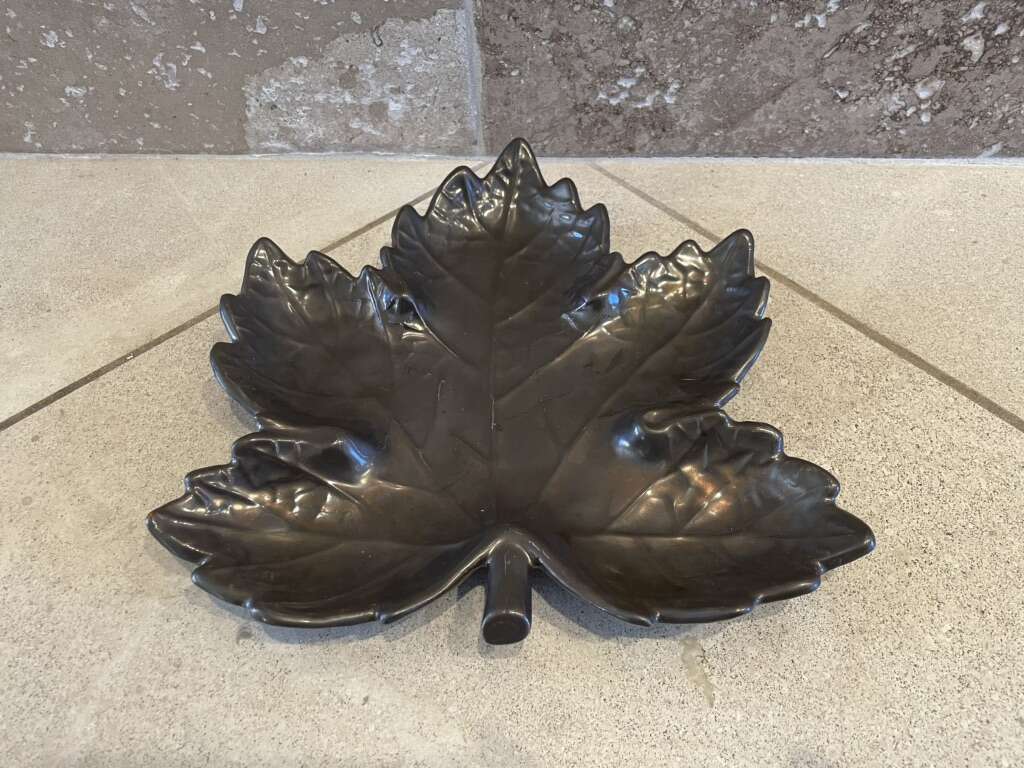 I have a ceramic leaf plate that is ceramic with a metallic looking glaze. It is about 11 inches across in both directions. There are a couple of small light scratch on the underneath side (see the third picture). The last picture shows that it is $28 online. See my other ads for jewelry, artwork, home decor and more.