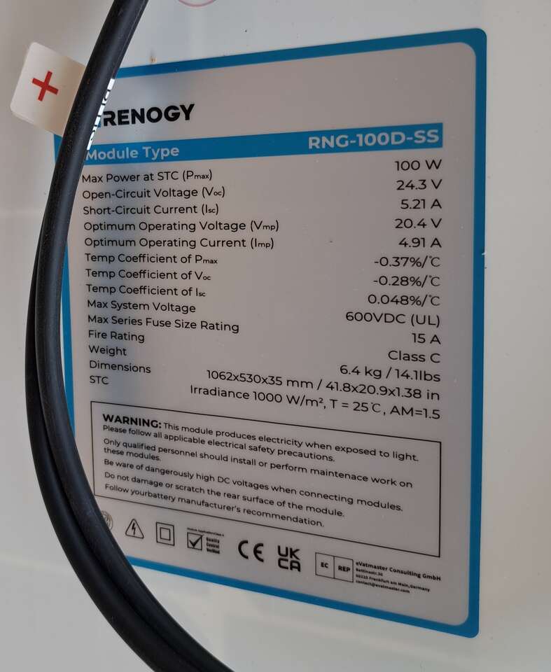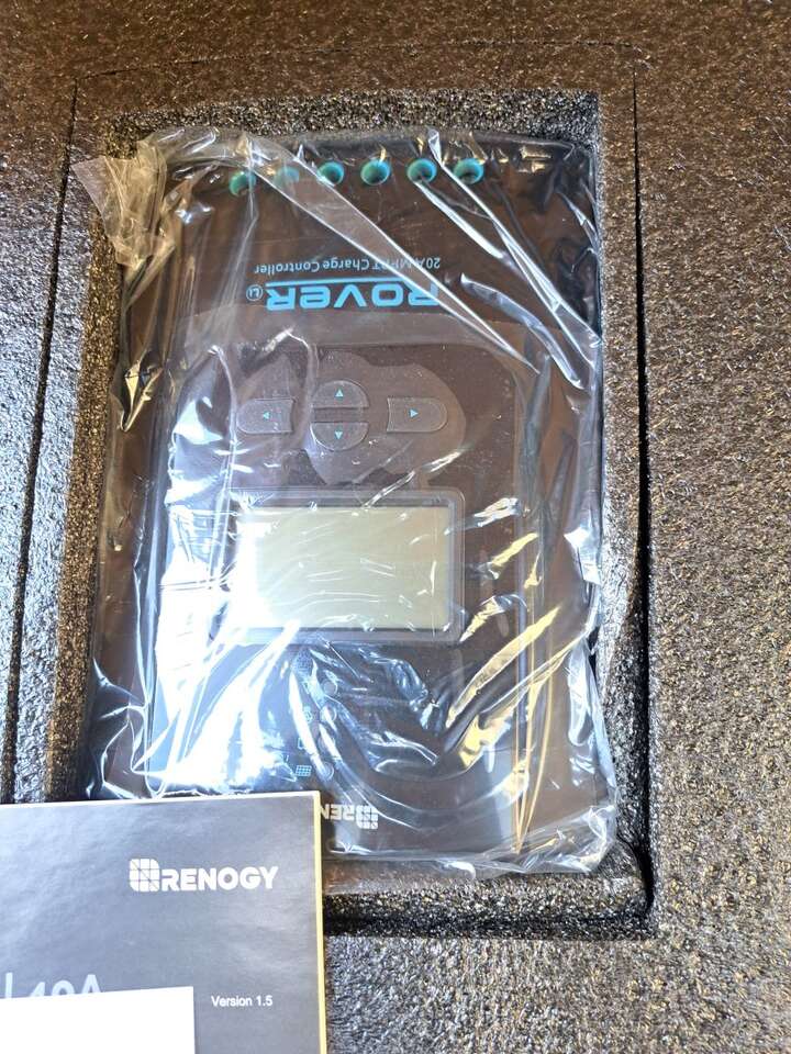 renogy rng-kit-premium100d-rvr20, 100 watt, 12 volt, off grid solar premiun kit with monocrystalline solar panel and 20 amps mppt rover controller black, kit includes cables, bluetooht module, mounts, fuse, L 41-7/8" x W 20-7/8", price $190.00, I'm located near 2300 s Reedwood Road
