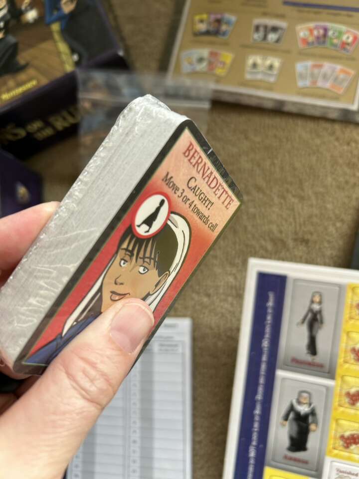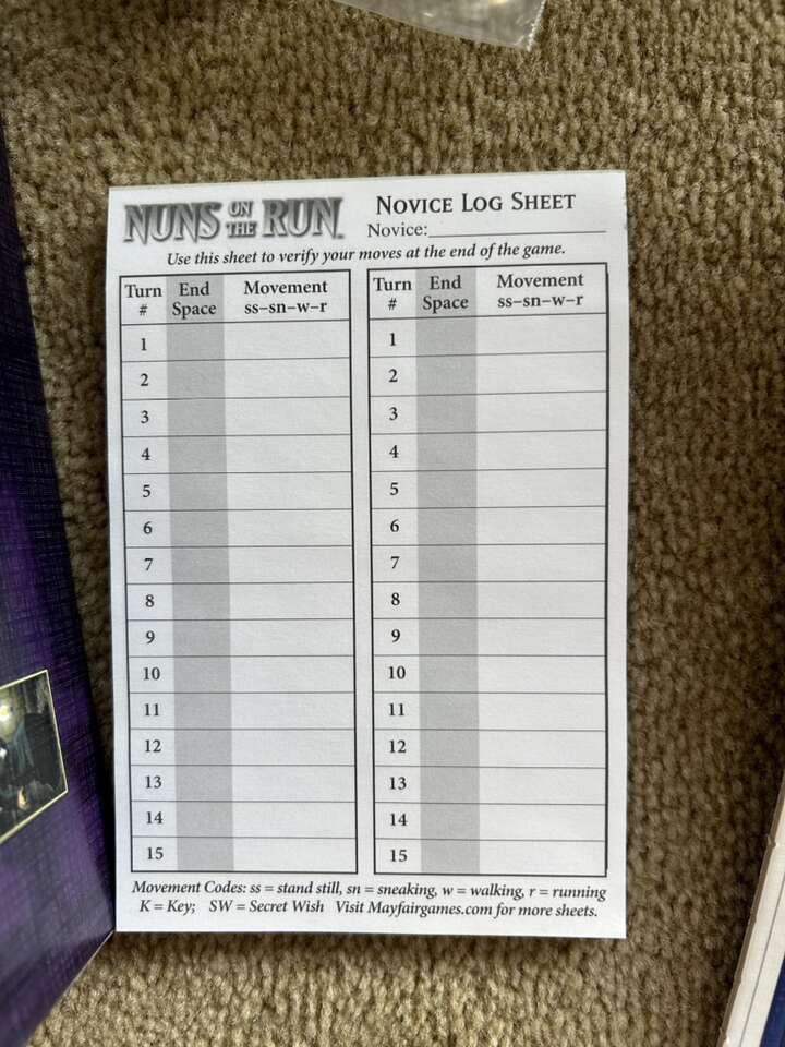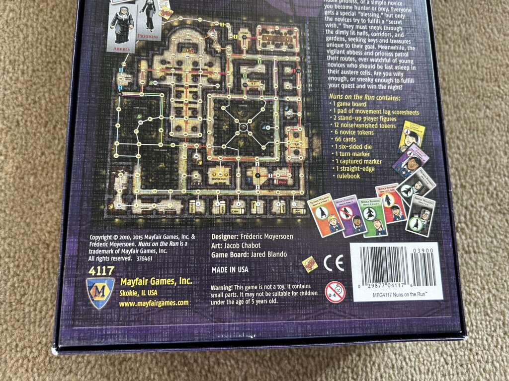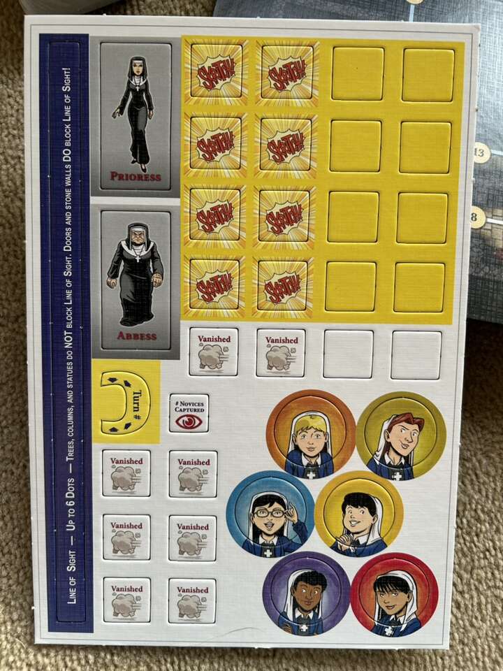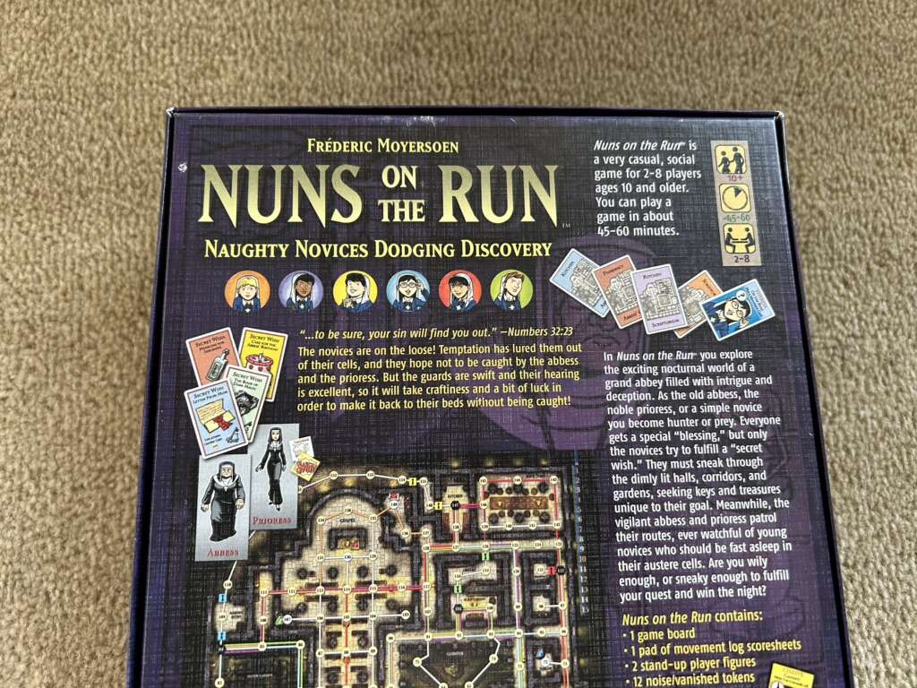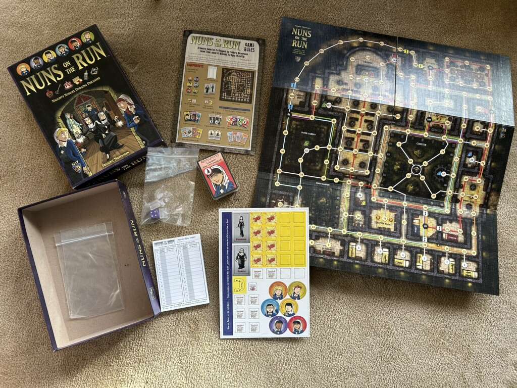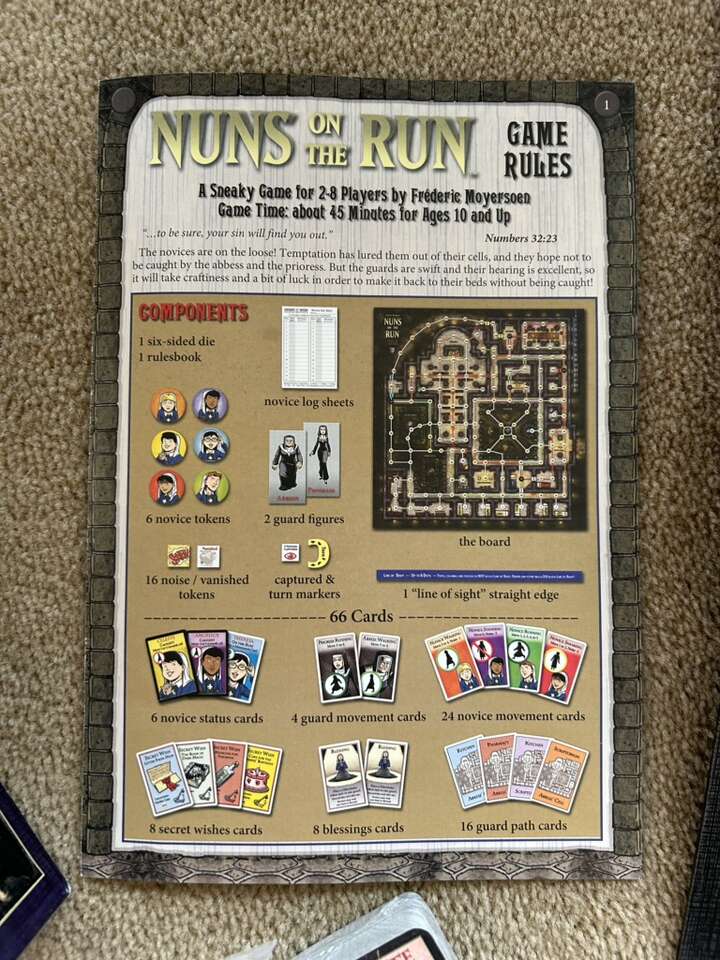 NEW (open box, sealed/unused components) Nuns on the Run Game: Naughty Novices Dodging Discovery. Age 10+, 2-8 players. Mayfair Games, Frederic Moyersoen, 2015. High-quality game. New, unplayed condition. Corner of box slightly worn. Text only. Cash or Venmo.