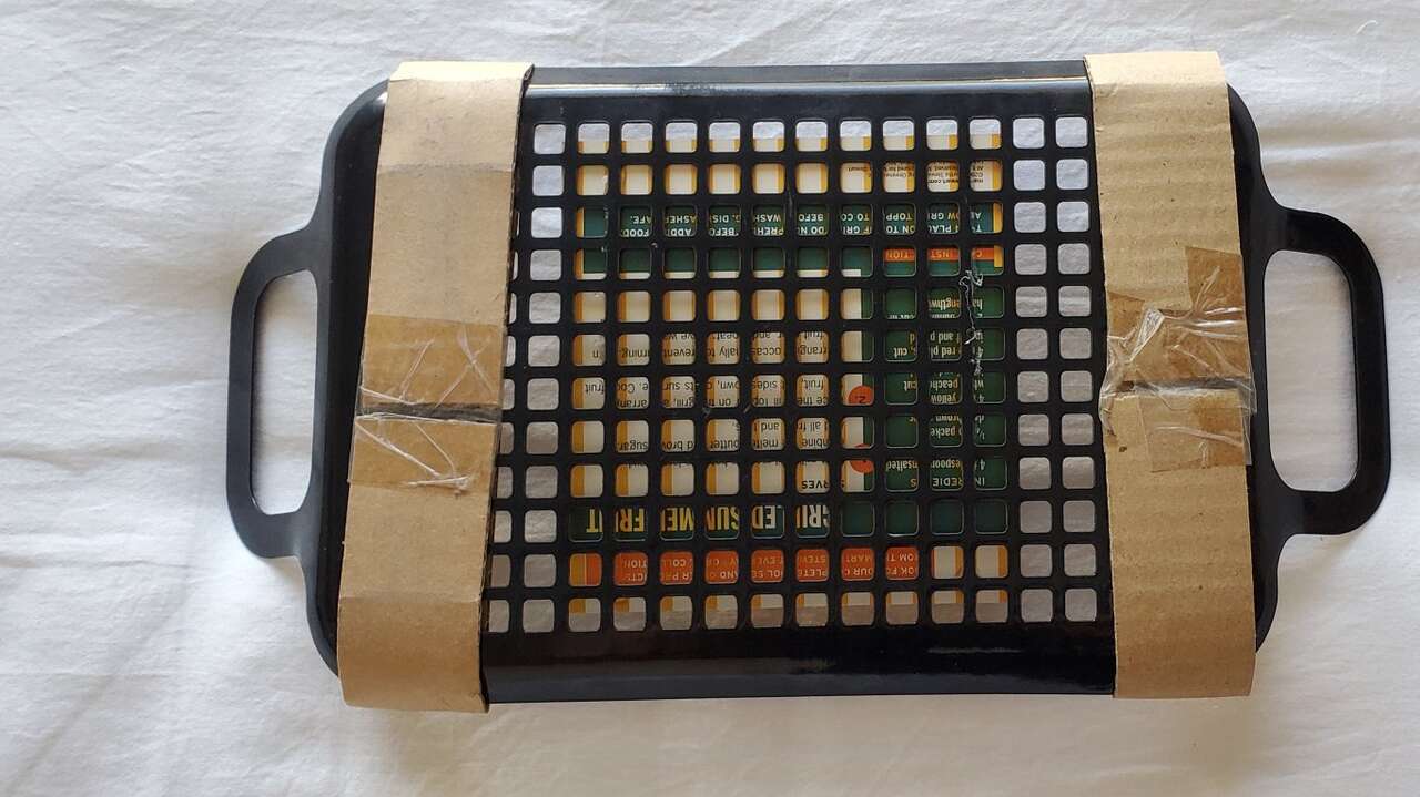 7 1/2" x 11 1/4" metal. Works grwat for fruit. veggies, little smokies, etc