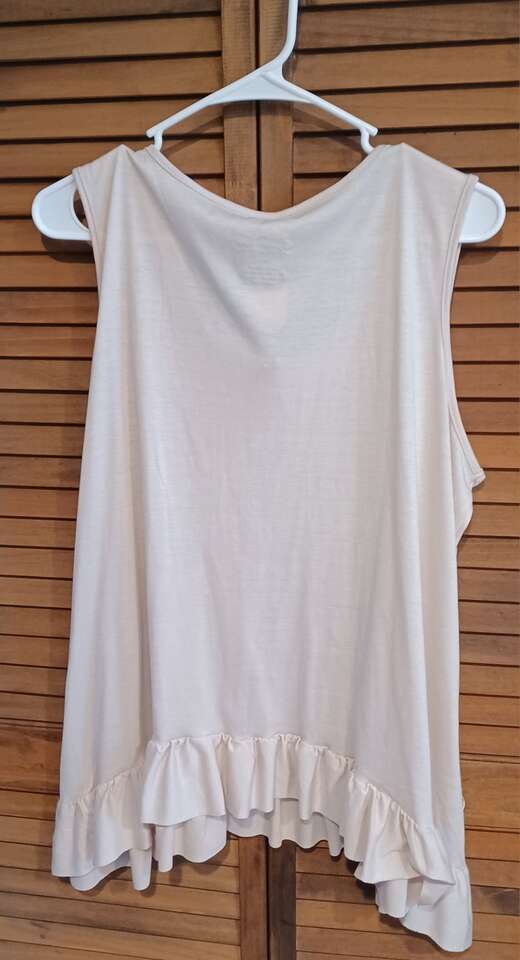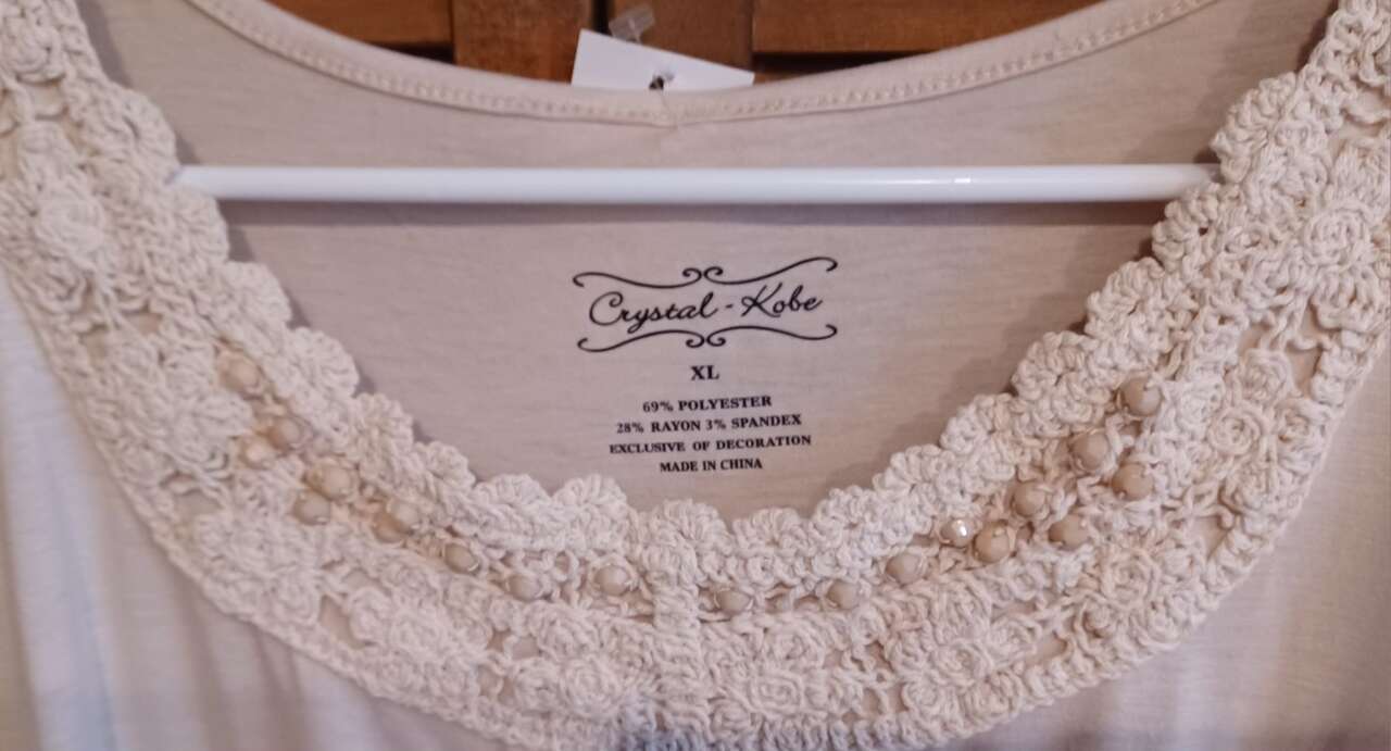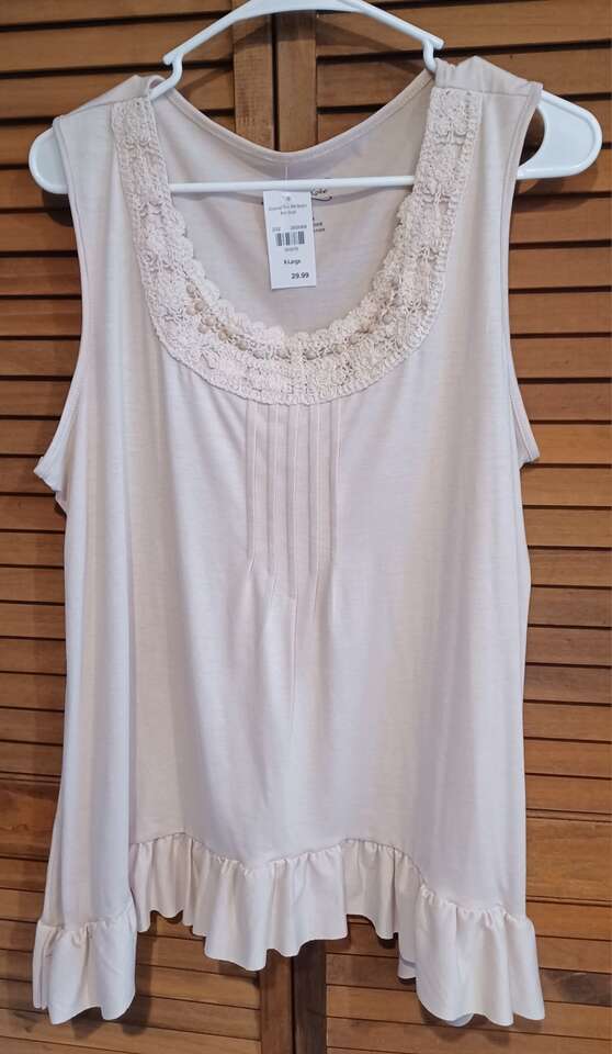 New with Tag Cream top with crochet trim and ruffle bottom size XL 69% Polyester 28% Rayon 3% Spandex