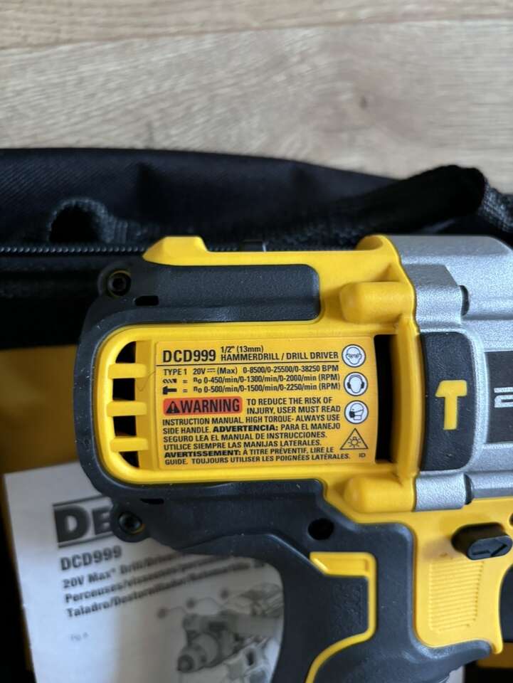 ZelleBrand new never been used. Dewalt flexvolt advantage hammer drill. Can be used with 20v batteries or flexvolt batteries. Has a nice long handle to help with the kick. Comes with 5ah battery and new model of charger. Model dcd999 drill, dcb205 battery, and dcb1104 charger everything you need. Home Depot sells drill with 4ah battery for $353.65 Check out my other dewalt listings