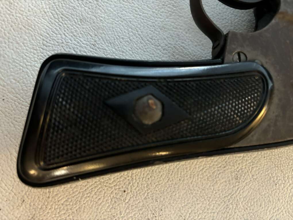 The M8 Flare Pistol or AN/M8 Pyrotechnic Pistol was the standard 37mm signal flare launcher used by the United States Army Air Force during the Second World War and the United States Air Force until 2002. The weapon is a double-action striker-fired launcher with a simple break-open breech-loading design, with a cast aluminium frame and stamped steel parts, designed to be simple enough that it could be made by the Eureka Vacuum Cleaner Company in WW2. The two distinctive curved projections on the top of the weapon are the latch for opening the breech at the rear, and a hook for securing the pistol in an aircraft: alternatively it could be secured by the muzzle using the four rectangular locking lugs on the barrel if the aircraft had the appropriate mounting. $250.00. OBO