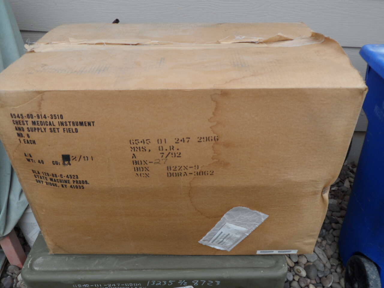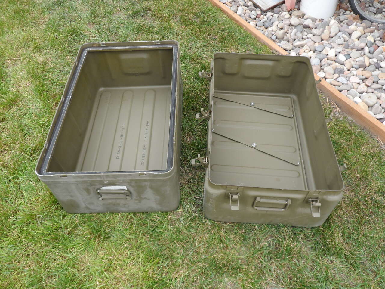 Military surplus item. Military uses these for the pre-packaging of medical supplies for field hospitals. Except for the 8 latches, the chest is all aluminum. These chest seal so well that there are pressure release screws located on each end of the chest, one for each half of the chest. The chest comes with an internal separator that latches onto the top portion of the chest dividing the two halves. The top portion has a rubber seal that the edge of the bottom half sets into. These chest are often referred to as bug proof, water proof and bear proof. Dimensions are 31 inches right to left, 19 1/2 inches front to back and 21 inches tall. There are two of these available, the one not in a box is very slightly used while the cardboard box contains a new chest. Used box is $50, the new is $60.