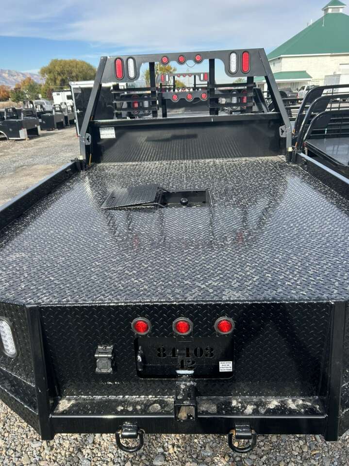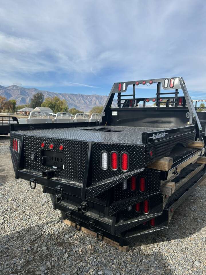 Bradford Built Workbed Gooseneck and receiver hitches Fold down 4” side rails Front and rear board pockets 8” skirt with wheel well cut out LED lights 7 way plug
