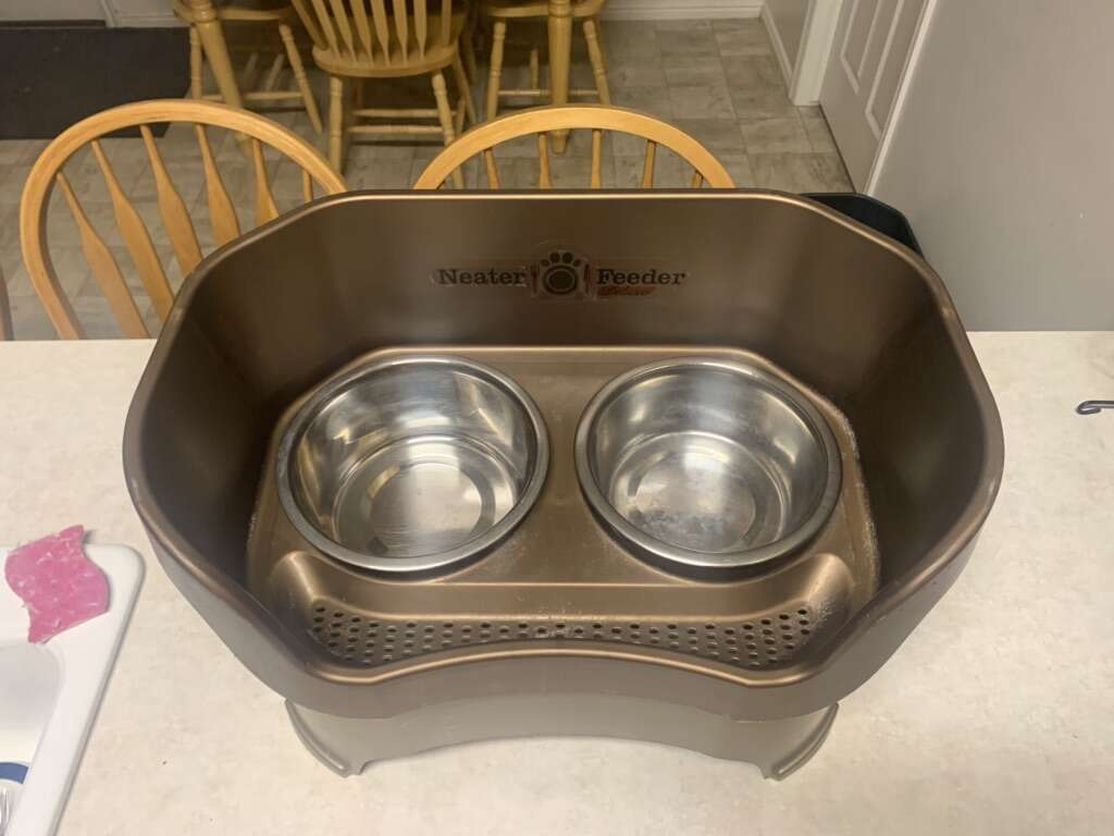 Neater feeder. I used this for my boxer and loved it. Definitely saved me a bunch of mess. I believe this is large size. But could be wrong. Still in good condition.