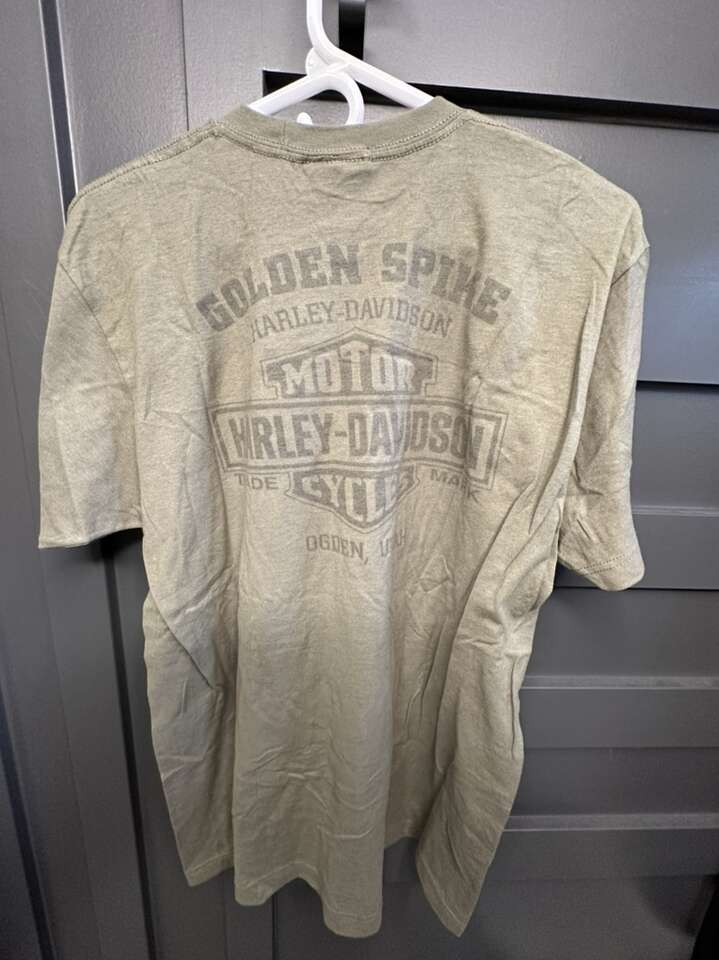 ApplePayHarley Davidson T-shirt Golden spike New W/tags size L please Text 801-644-3368 Thanks No Codes No Trades