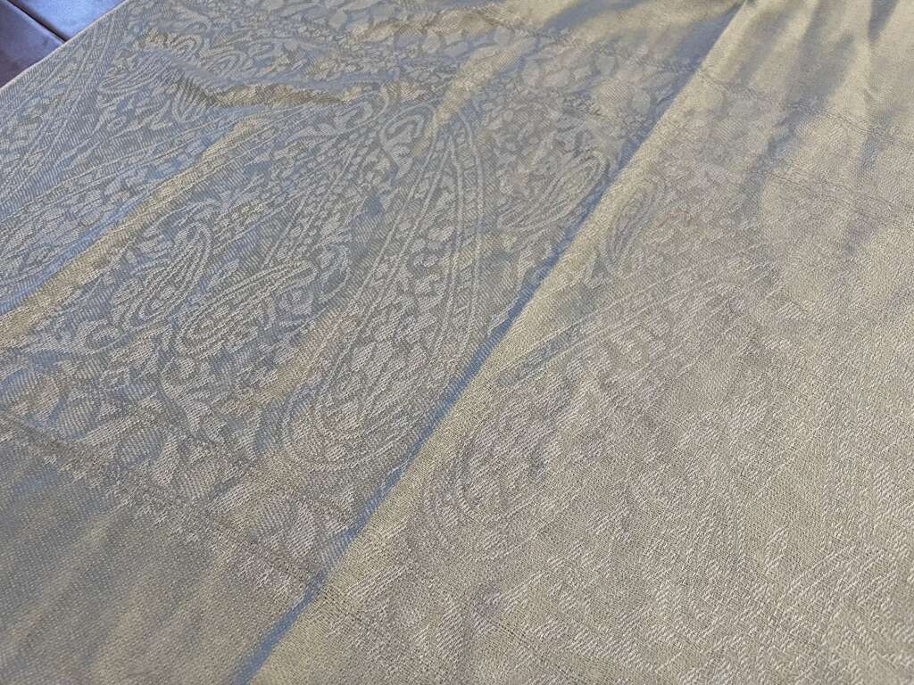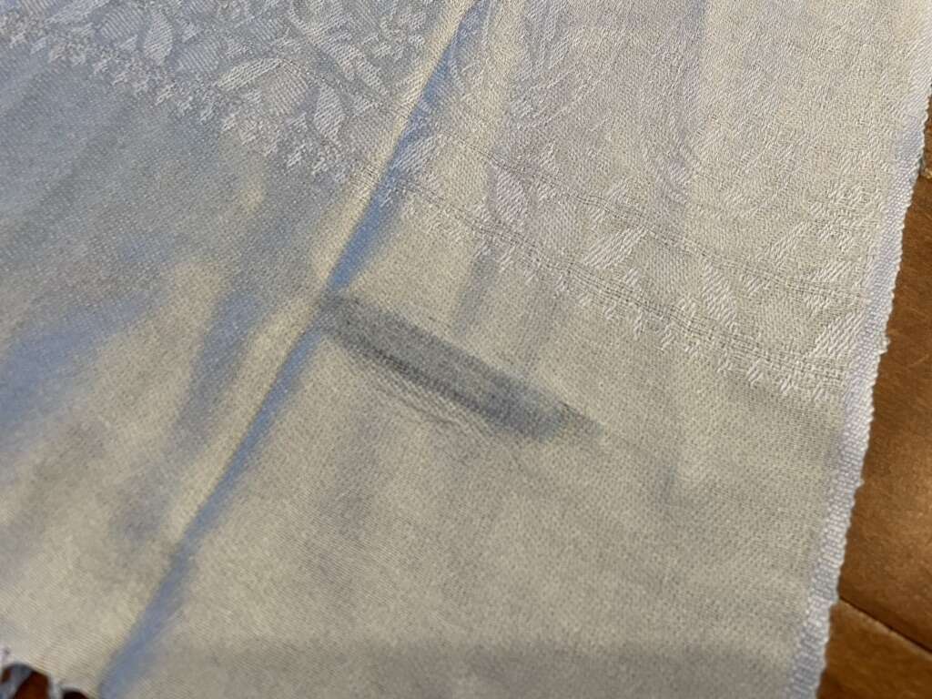 I have a long light blue piece of fabric that could be a scarf, runner or throw for a couch or chair. It has a beautiful subtle pattern and fringes on the ends. It is 72 inches long not counting the fringe and 26 inches wide. The only problem is a rectangle spot where there used to be a price tag (see the last picture). I have not tried washing it to see if that will come out. See my other ads for jewelry, artwork, home decor and more.