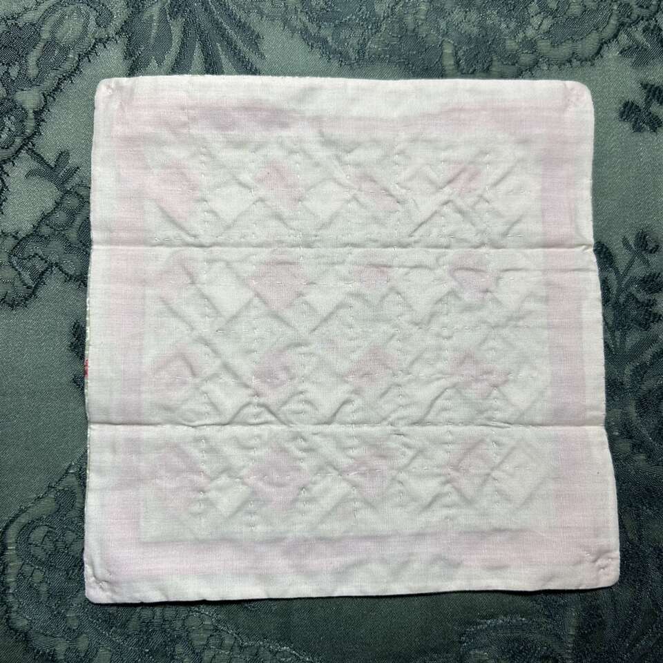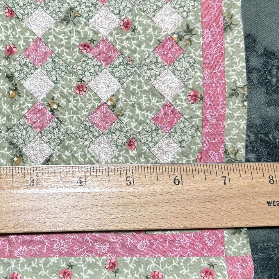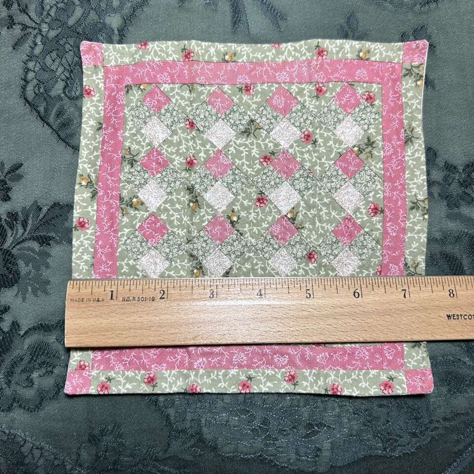Dainty Miniature Hand-pieced Quilt is perfect for display in a frame or as a doily on furniture or used for a doll-house. Measures 7.5” X 7.5” square and is 1/8th scale. Wonderful 100% cotton calico fabrics were carefully choosn tiny miniature prints that creates the illusion that the quilt is larger than it actually is. Batting was not used- only a backing, like a summer quilt. No rips, tears or defects. Smoke free. Delivery available to a convenient location when in your area for $5.
