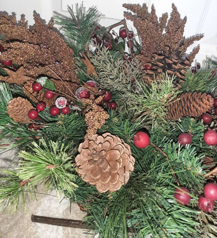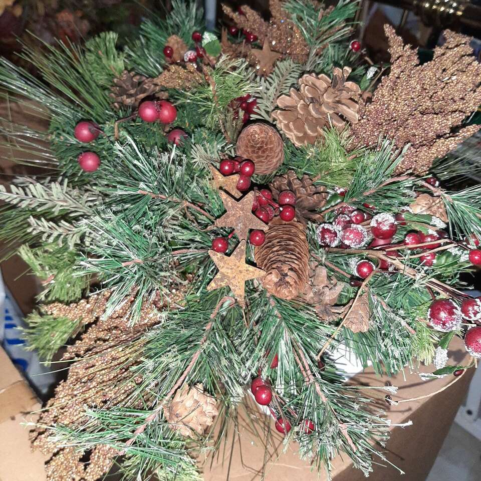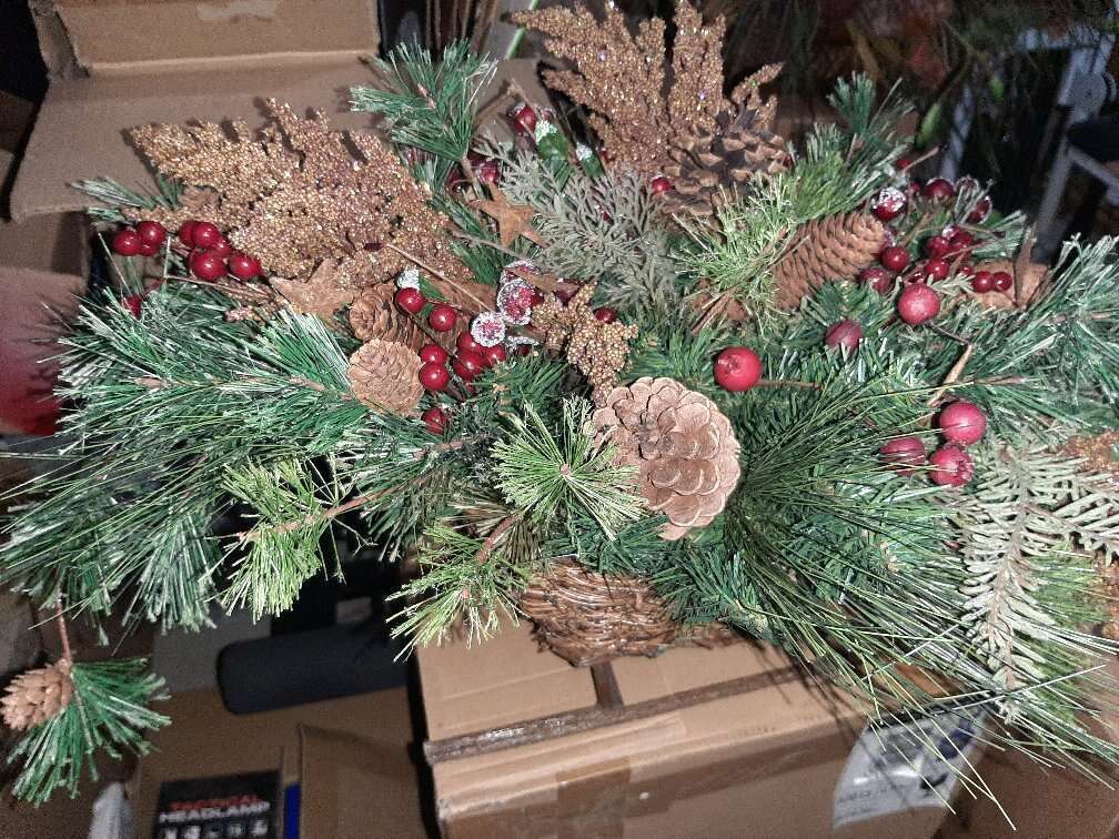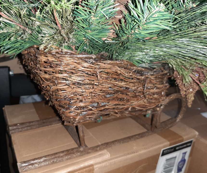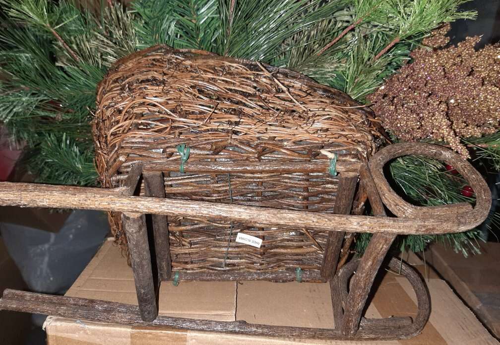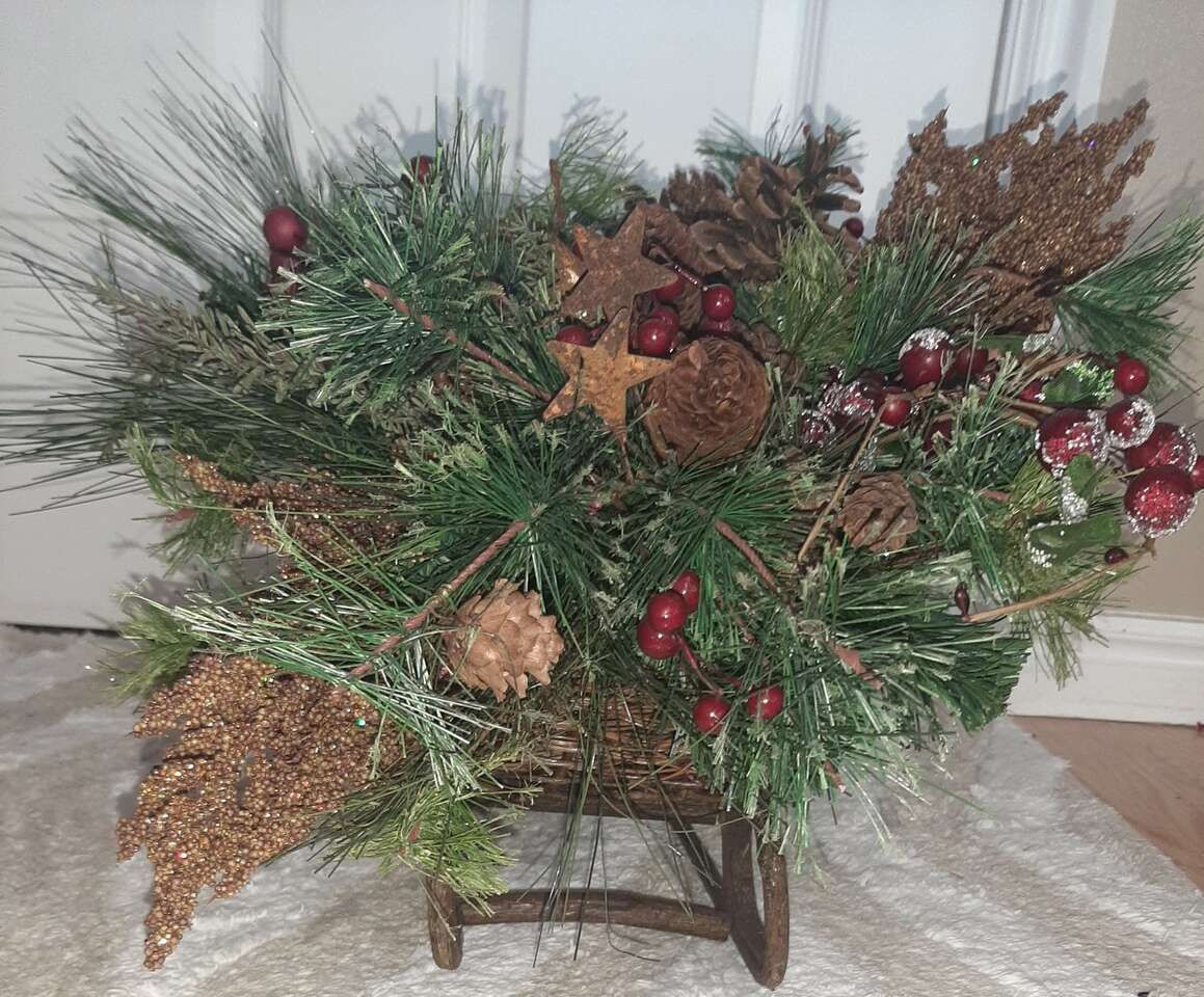Great condition table centerpiece decor for the holiday season. Has pine boughs and pinecones, sugared berries, metal stars, in a wicker/wood sleigh. Branches are wired for adjusting. Smoke free. measures approx:: 20x12x13 Sleigh is about 8inx6in