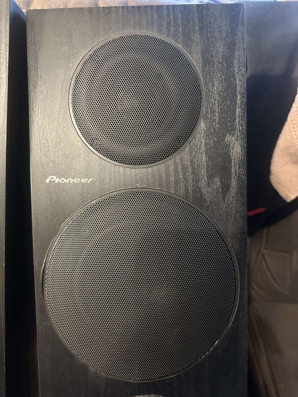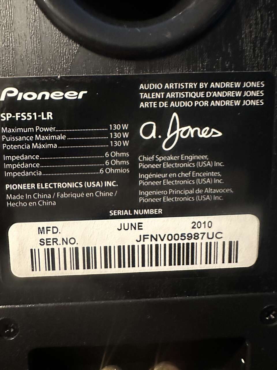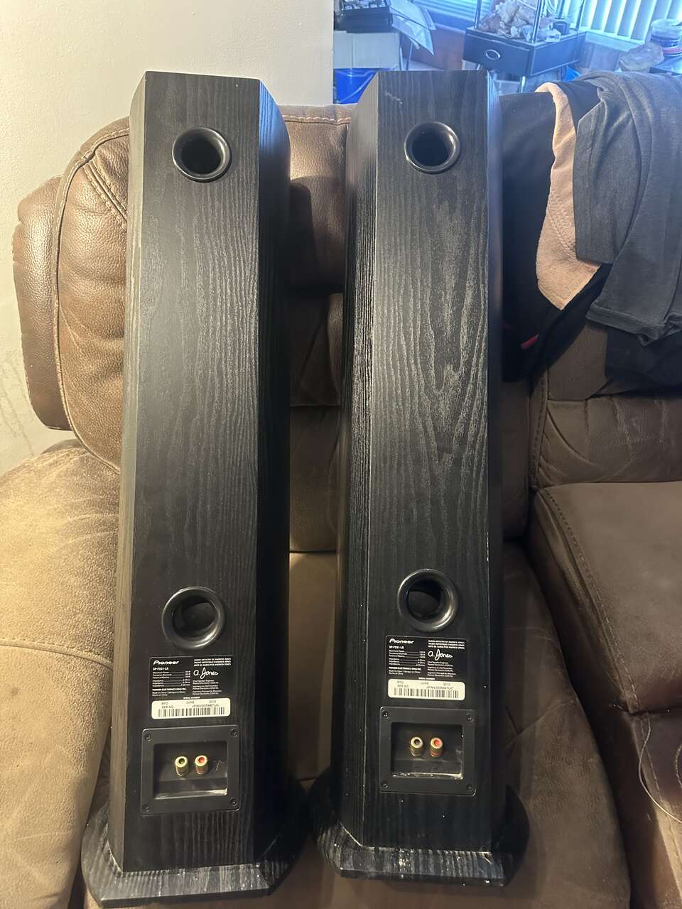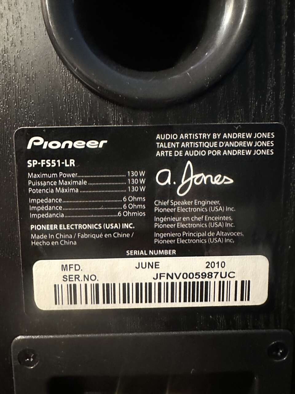 PayPalTESTED WORKING! They sound awesome. There are minor age imperfections on area around speaker edges (see pics). This is no way affects how they perform. $250.00 OBO This is highly rated compact Pioneer floor standing pair of speakers (left and right) designed by Andrew Jones with Three 5-1/4” Structured Surface Woofers, and 1” High Efficiency Soft Dome Tweeter. Dims are 10.70 x 8.90 x 35.20 inches. CURVED DESIGN. These speakers utilize a RF Molded Curved Cabinets design to reduce internal standing waves, resulting in high-performance and exceptional sound quality. FEEL THE BASS. A structured surface with oversized magnets improves rigidity and bass accuracy. A vented pole piece also improves bass response for deep, beautiful sound. TWEETER EFFICIENCY. To widen the sweet spot of the 1-inch High Efficiency Soft Dome tweeter, we’ve engineered a custom wave guide. Increasing tweeter efficiency, together an 8-Element Complex Crossover, allows the SP-FS52 to bring the sound. COMPLEX CROSSOVER. 8 Element Complex Crossover perfectly blends audio between the woofer and tweeter for greater accuracy.