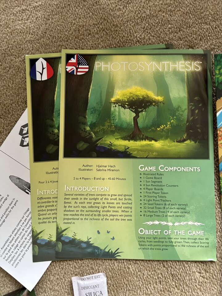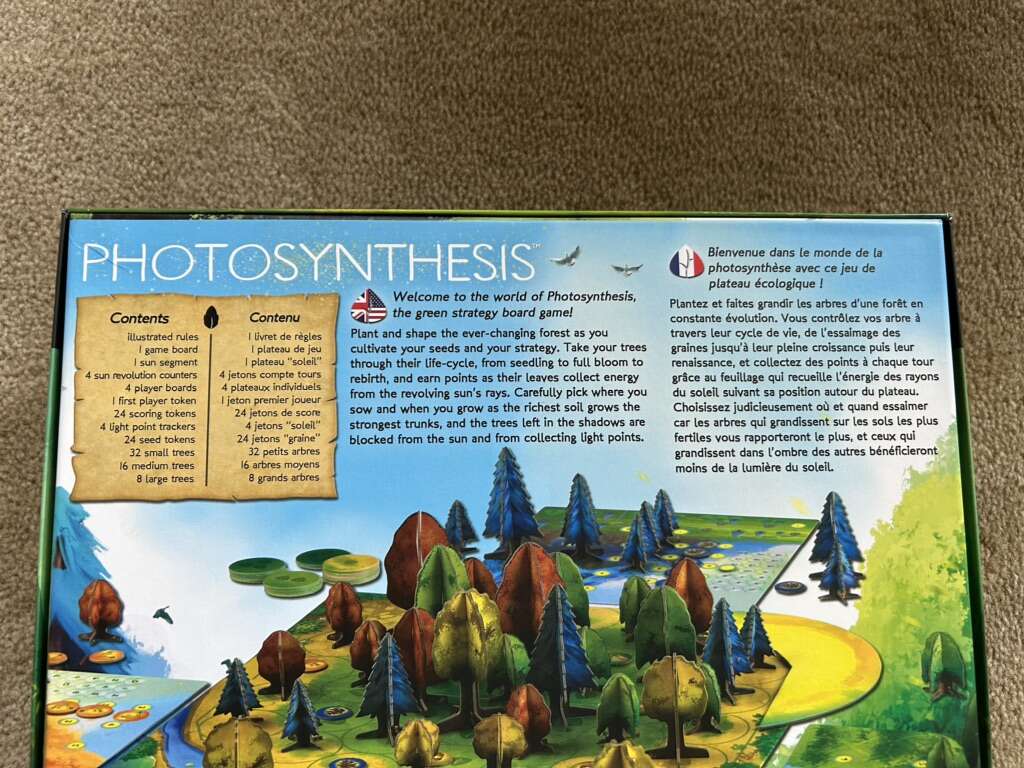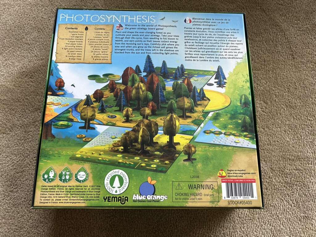 NEW (open box, unpunched components) Photosynthesis: The green strategy board game. High-quality, award-winning game by Blue Orange, Hjalmar Hach, Sabrina Miramon. Complete, no missing pieces. New, unused condition—all game pieces unpunched in box. Text only. Cash or Venmo.