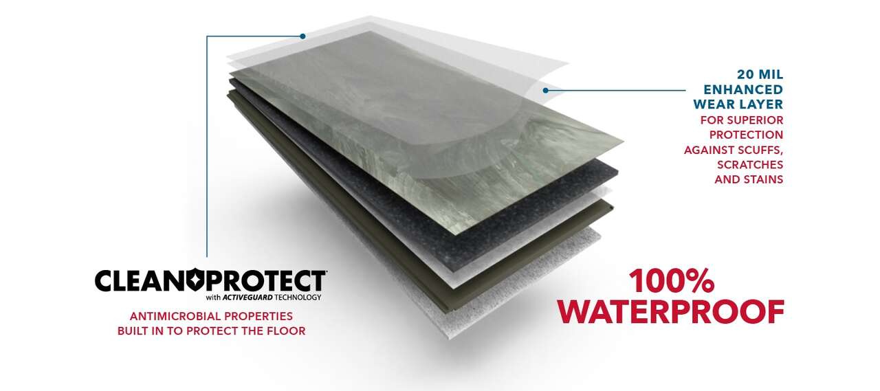 This durable rigid vinyl floor is the perfect solution for kitchens, baths, laundry rooms or any room where you want a waterproof, wood-look floor. These wider planks feature weathered graining in a blend of blonde and light brown tones with a natural edge for a rustic look perfect for a variety of décors. Plus, installation is easy with a click joint and a pre-attached pad. With a beautiful wood look, waterproof durability and CleanProtect® technology, this floor is perfect for busy families with children and pets.