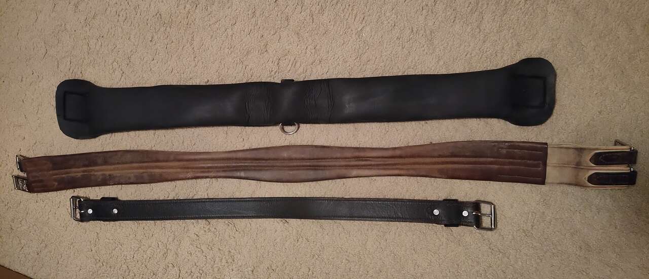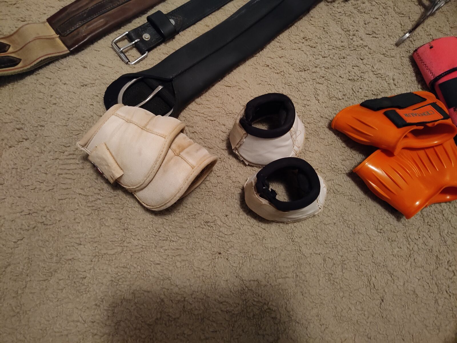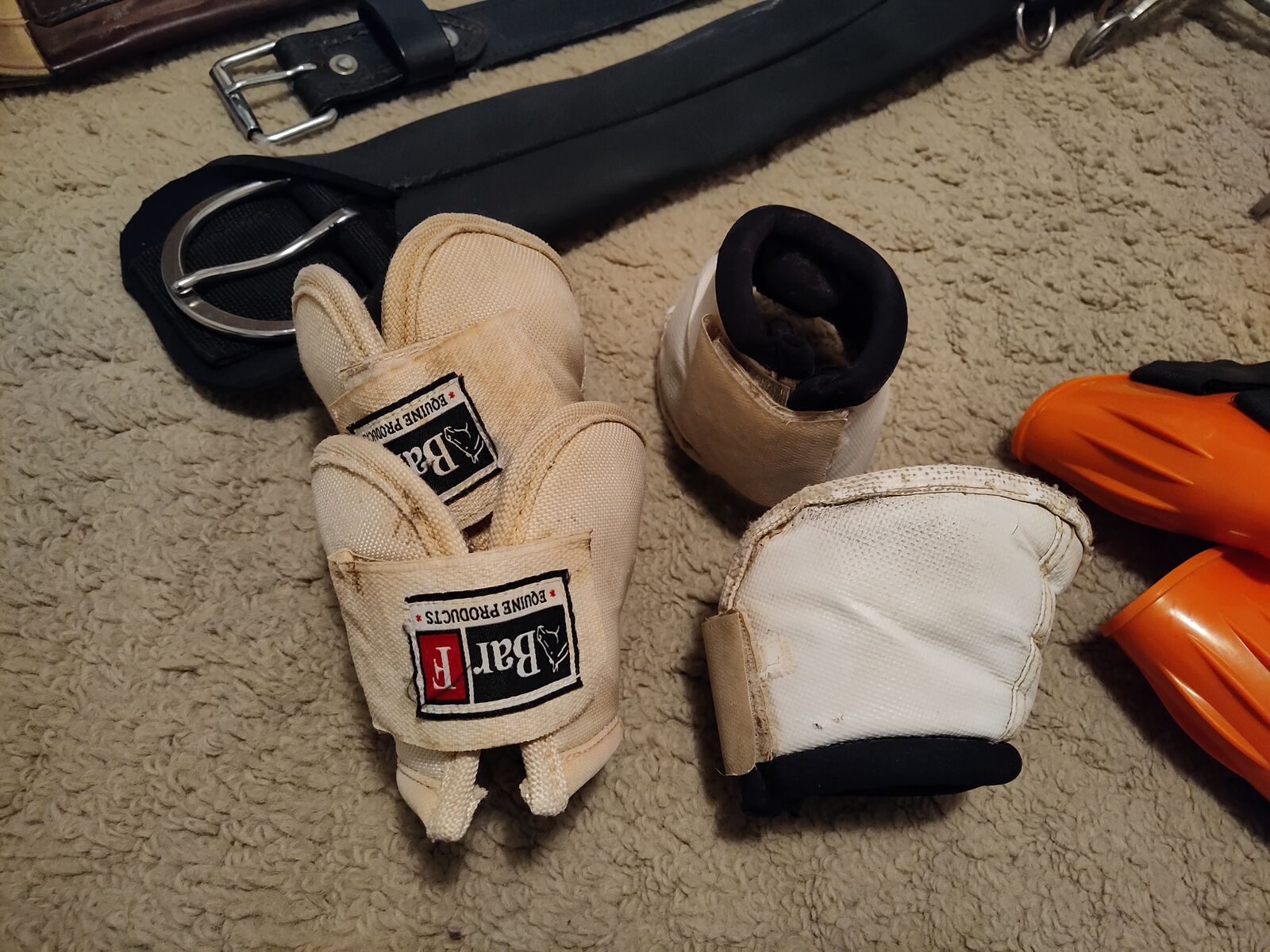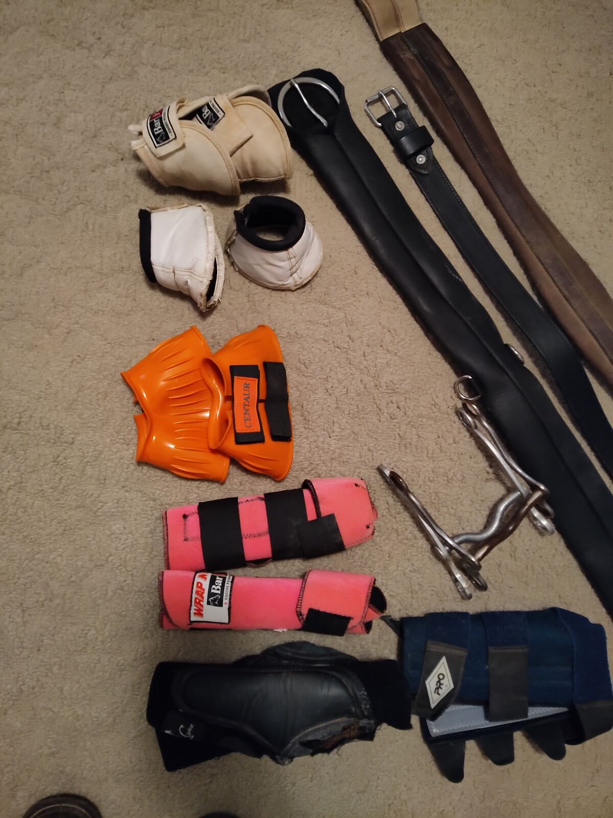 *Price drop!!*English cinch (52") and bell boots. Western neoprene cinch (40") brand new and black back cinch. Several pair of leg boots. Pink fits like a medium and the 2 pairs of white bell bots are mediums I believe. And 2 curb bits. Everything is in usable condition, maybe just a bit dusty. Stuff we just don't use or doesn't fit our horses. Would like to sell it all together for $40, but would sell individual pieces. Message or text with questions or an offer. Thanks for looking.