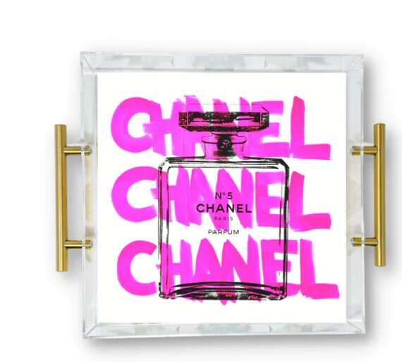 Add a touch of elegance to your space with this Chanel No.5-inspired large tray by Tart by Taylor. Perfect for the chic, classic individual who loves a hint of color, this tray is ideal for organizing or adding a statement piece to your home decor.
