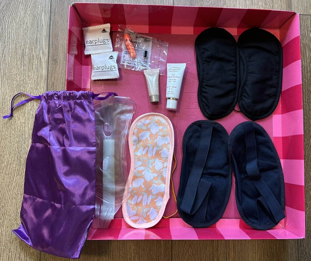 (6) Six Eye Masks, (3) Three Ear Buds, Eye Gel, Concealer + Bag