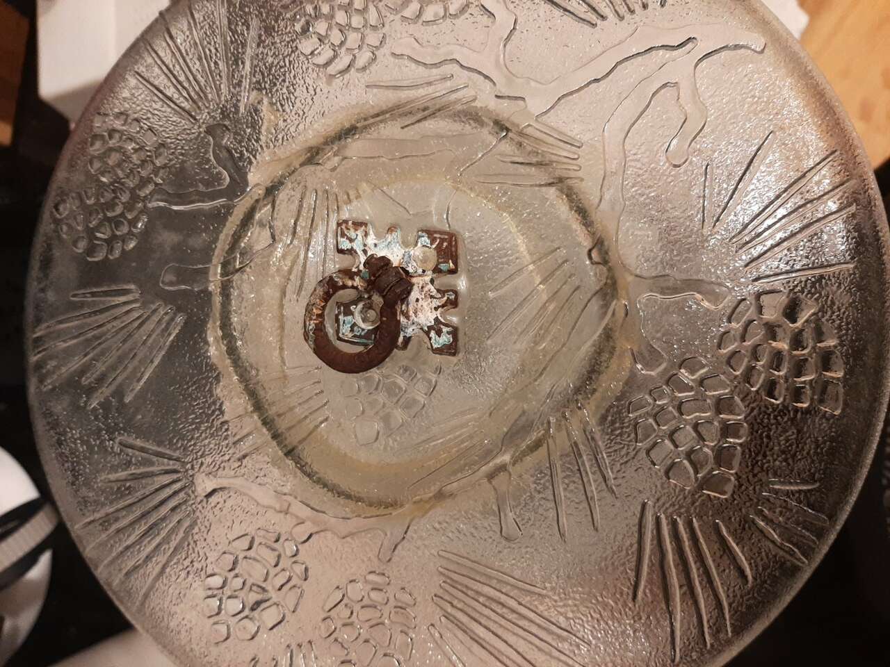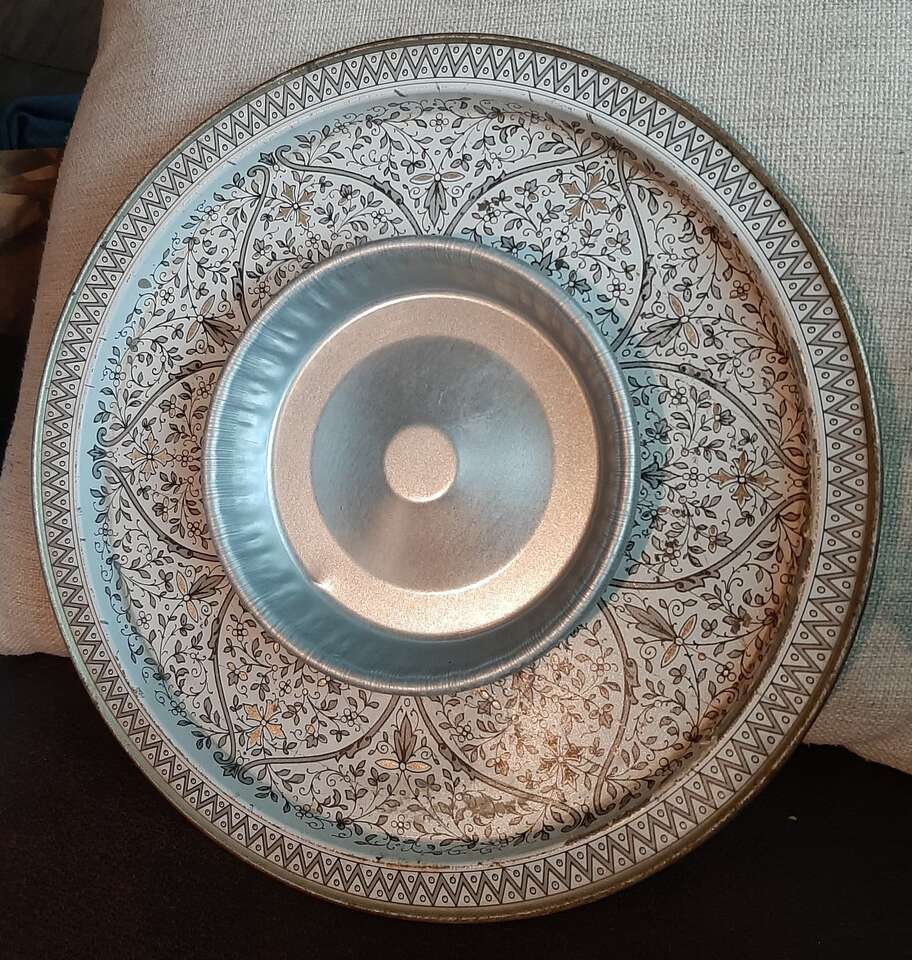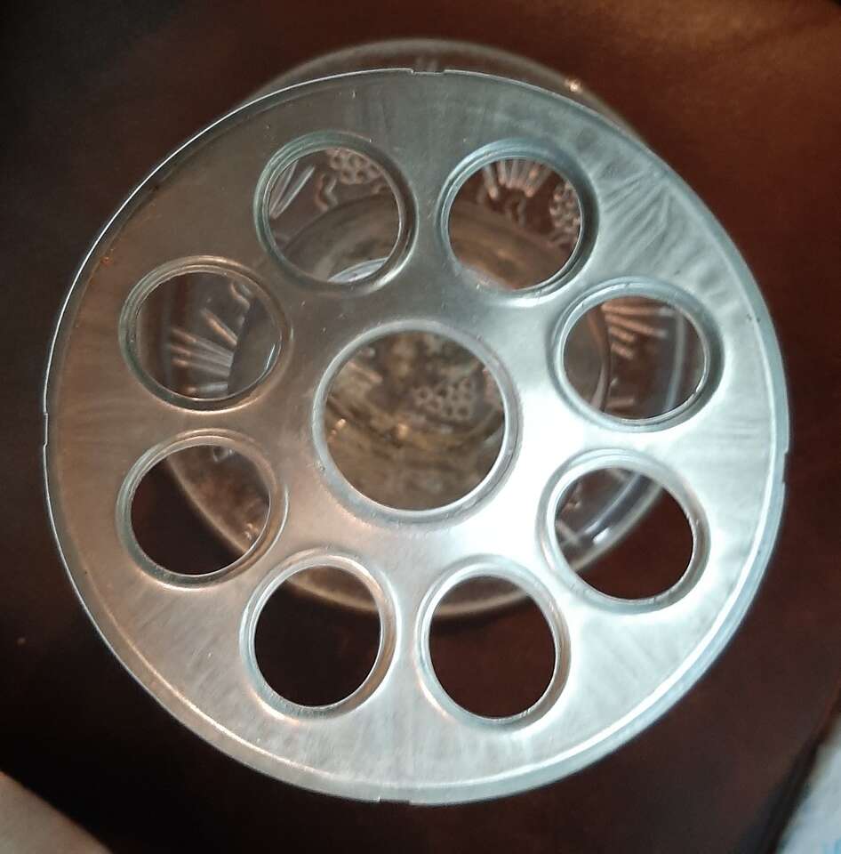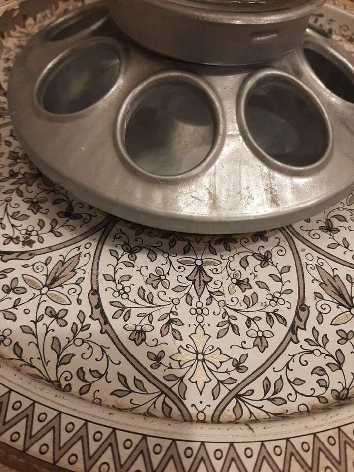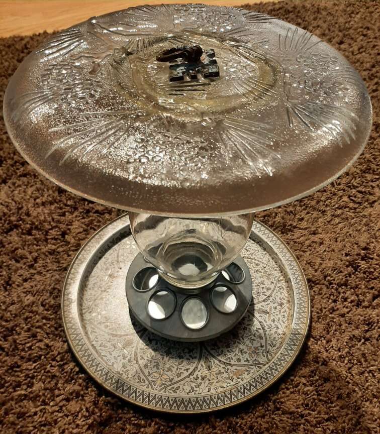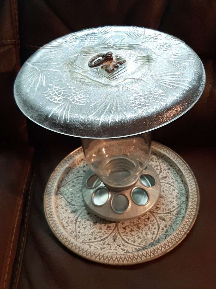 Unique handmade hanging Birdfeeder made from a 12" metal venetian cake plate, 9" glass Kerr jar, and 10" thick glass etched plate with a metal loop on top for hanging. Jar is removable for easy filling and cleaning. One of a kind! Smoke free environment! Measures aprox 11" tall & 12" wide & weighs aprox 5 pounds