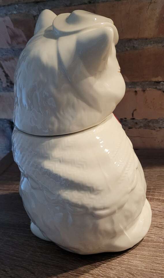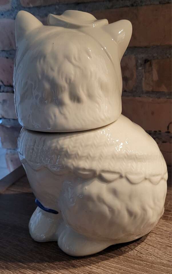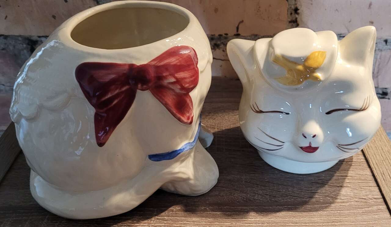 This Vintage Shawnee Puss N Boots Cat Cookie Jar is circa 1950’s. This smiling kitty cat is wearing a hat and shawl. It is in nice vintage condition for its age. This Vintage Shawnee Puss N Boots Cat Cookie Jar would make a great gift for the cookie jar collector or for someone with cat collectibles.