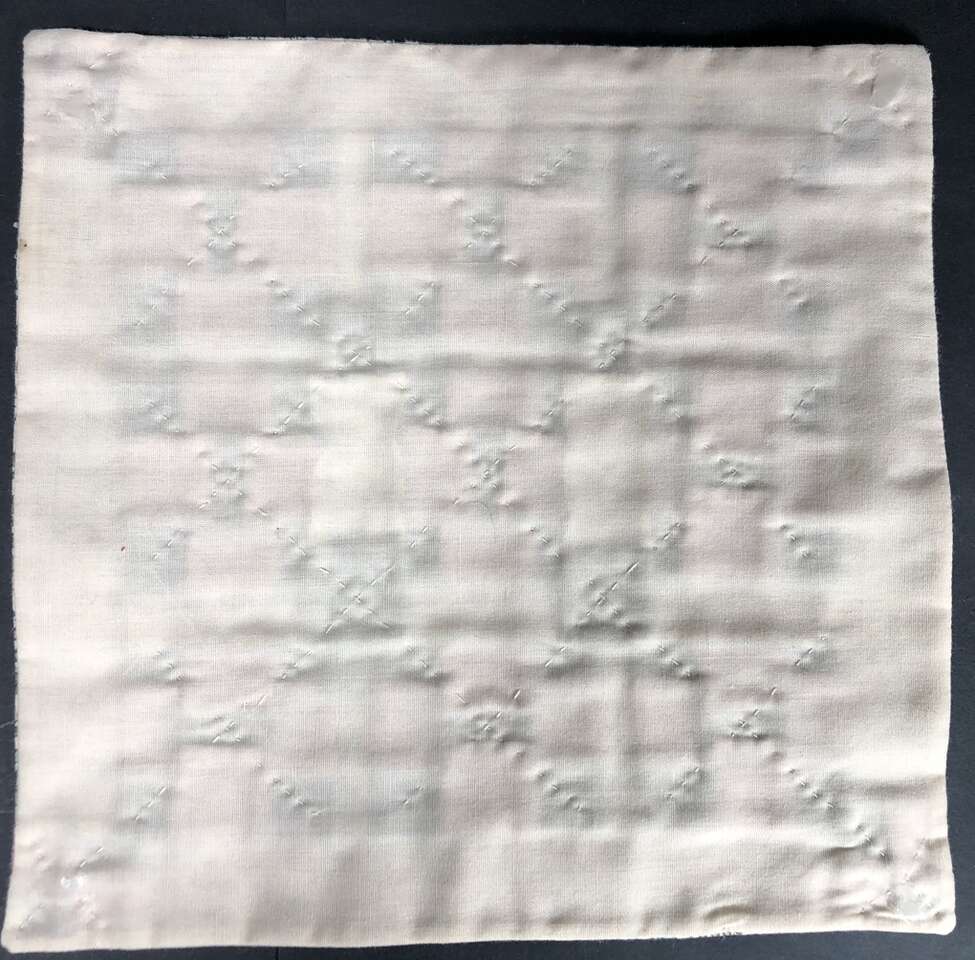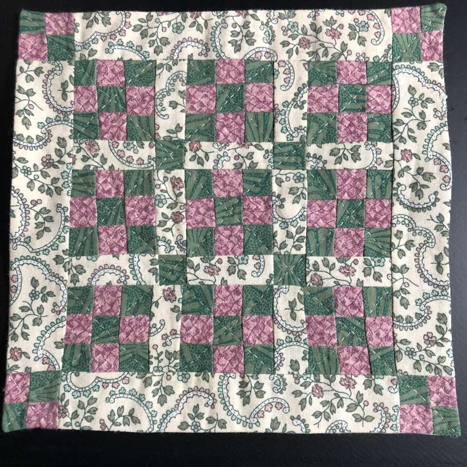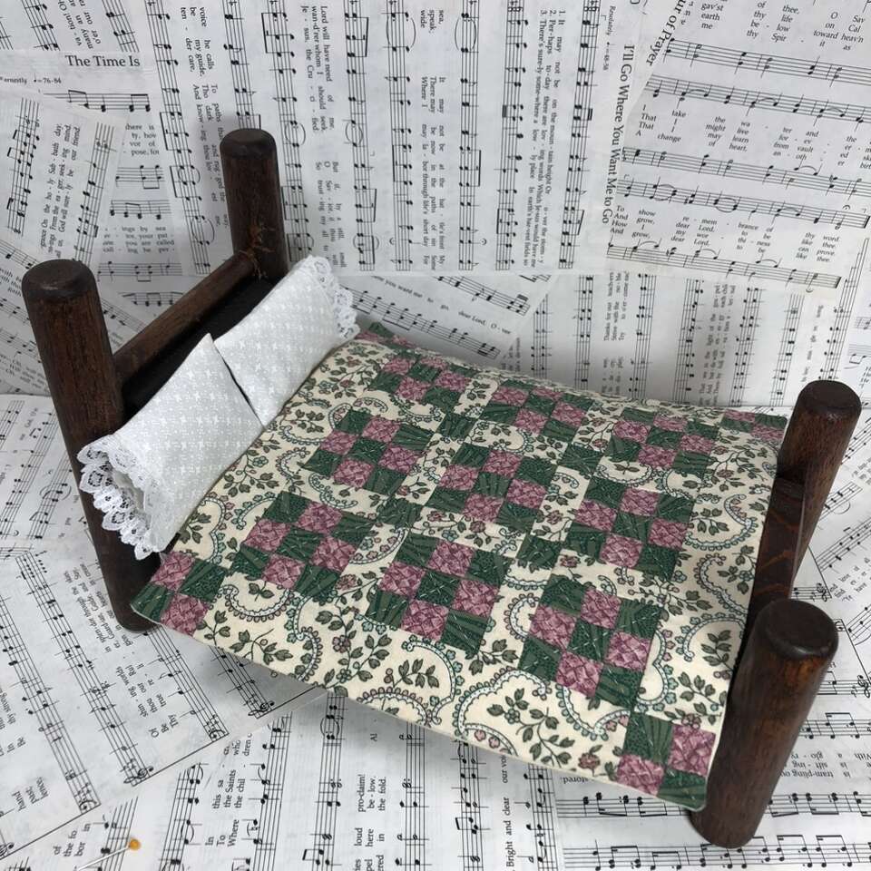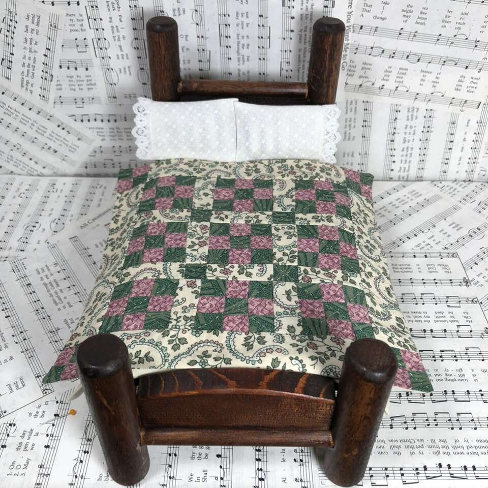Traditional Miniature Hand-pieced 9-Patch Quilt is perfect for a doll-house; 1/8th scale. Perfect for display in a frame; or as a “coaster” or doily under a lamp, etc to protect furniture. The seamstress that hand crafted this wonderful 100% cotton quilt chose calico fabrics with miniature prints to create the illusion that the quilt is larger than it actually is. Size is 7.25” X 7.5”. Pieced squares are 1/2” square. Made with 3 coordinated fabrics, with a top and back & no batting. Dominate fabric is the tiny floral print on an ivory background used in the border & sashing to set off the 9-patch blocks. No rips tears or defects except for a tiny dot of hot-glue on each corner previously used to fix the quilt in place- see 2 photos. Photographs are of the exact quilt you are purchasing. Smoke free.