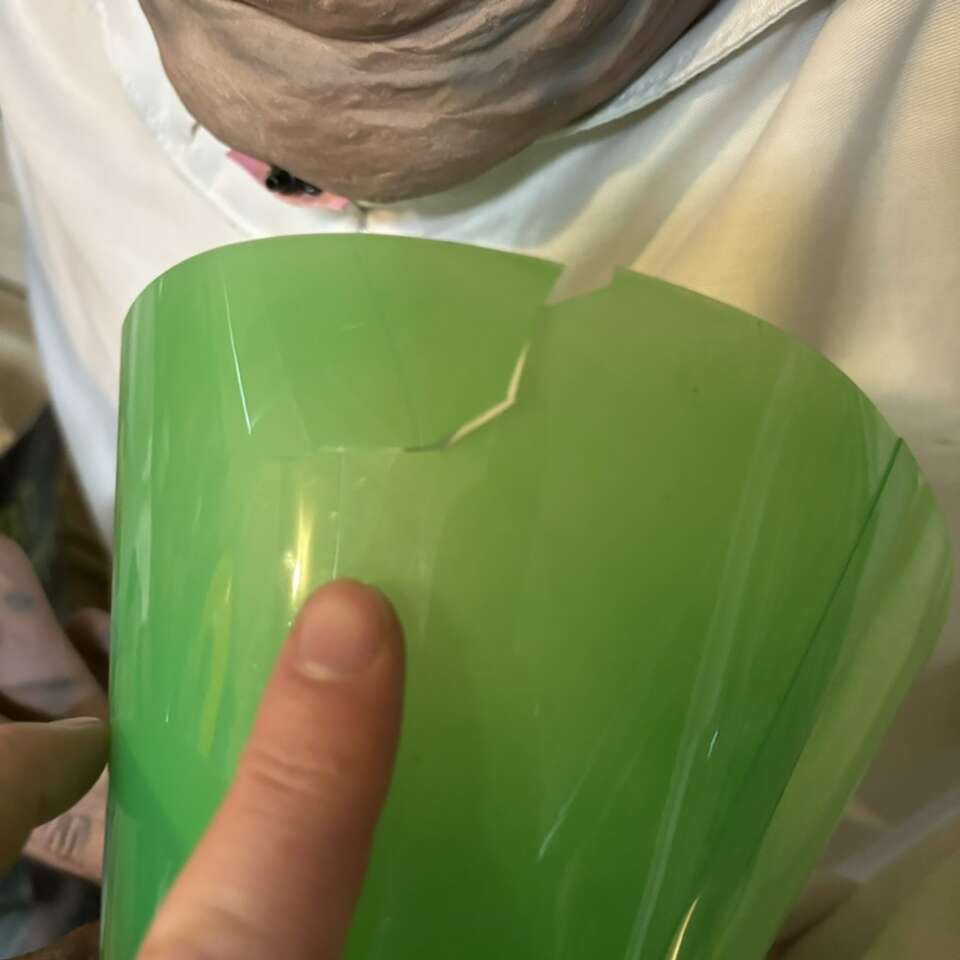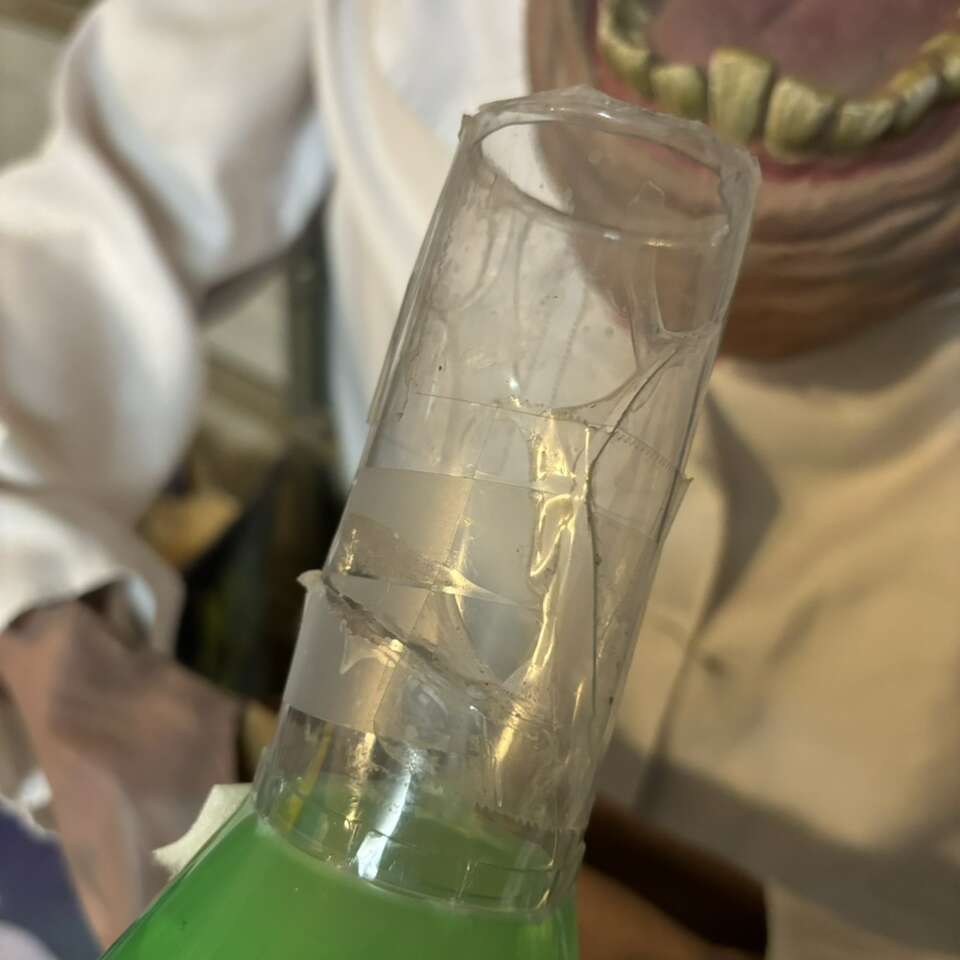 The beaker is cracked in several places and tape has been put in place to help keep together.