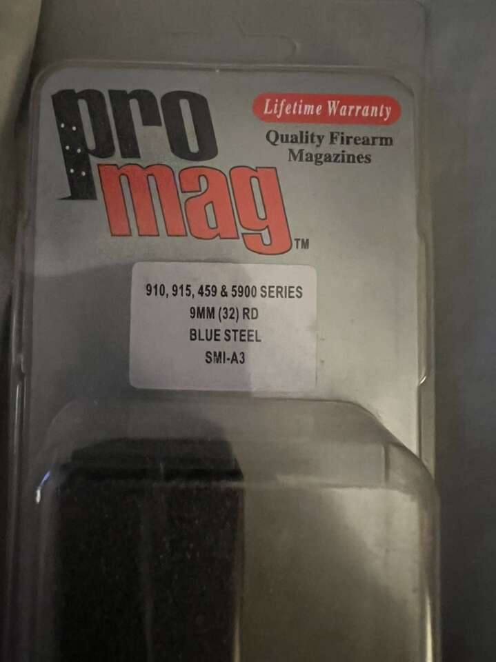 I have a brand new pro mag 9mm 32rd gun magazine for sale. It fits smith and Wesson 910, 915, 459, and 5900 series. Thanks $15.00 obo