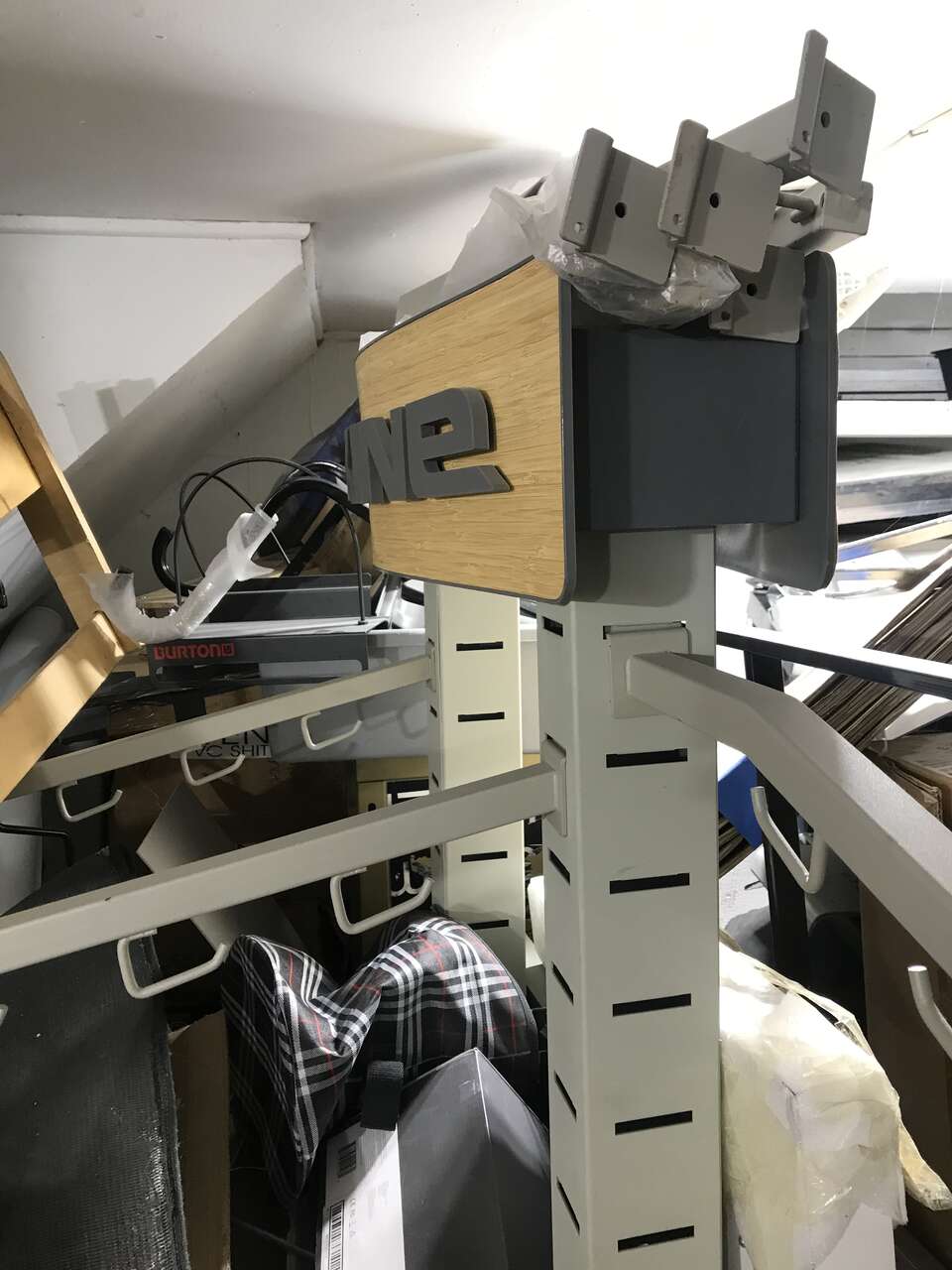 there are three of these tower displays the base is about 3' x 3' on casters so it rolls around the two towers that stand about 6 feet tallhave slots that have slots down the entire length that fit the waterfall arms that are super sturdy and have hooks for things like backpacks or other gear perfectly balanced to withstand extra weight multiple different arm options and very modular each tower is $100 with the dakine logo that can be removed and replaced with another logo and the waterfall arms that are heavy duty steel are 2.50 each