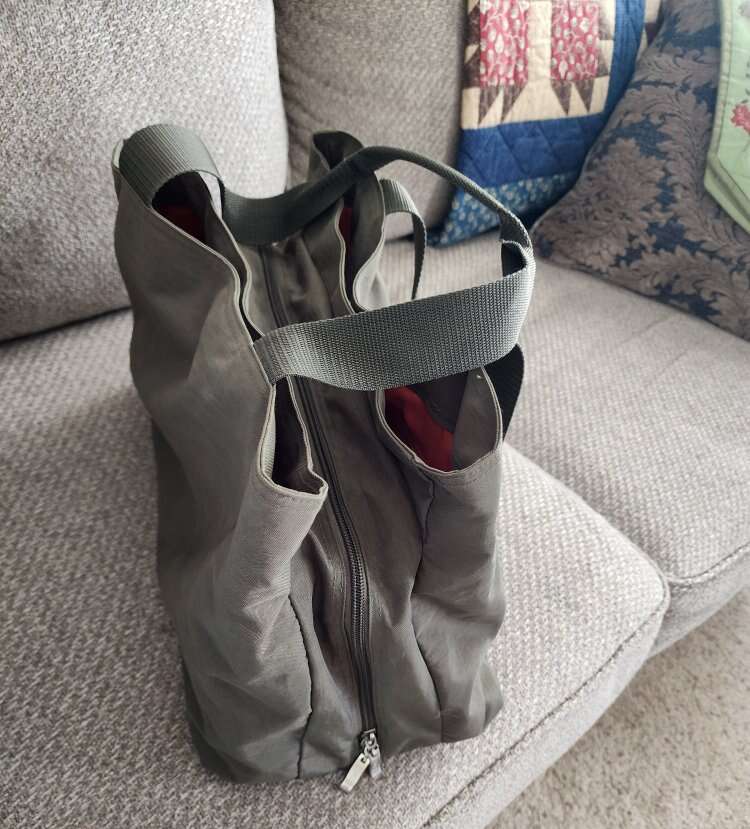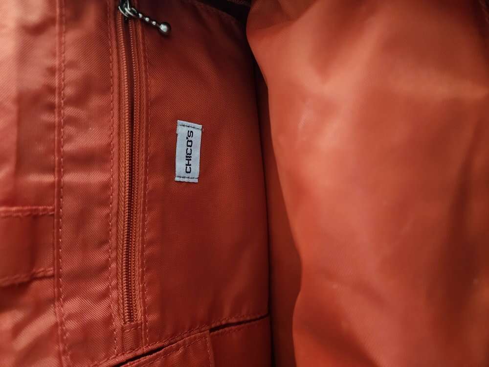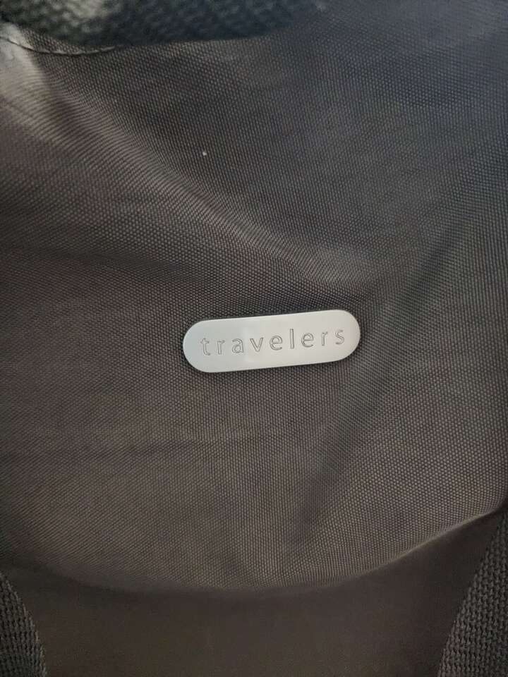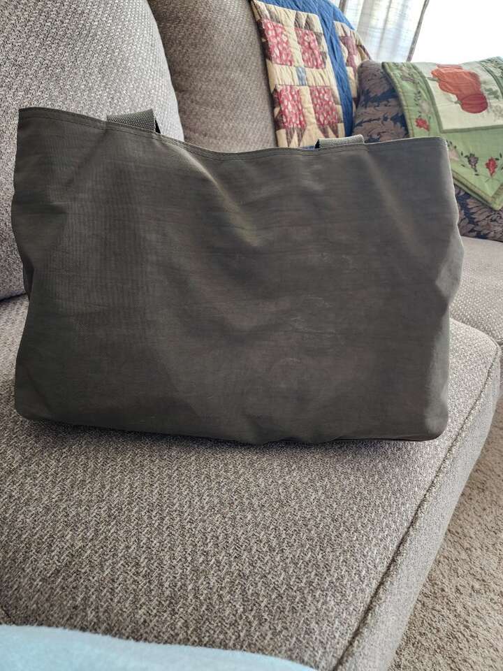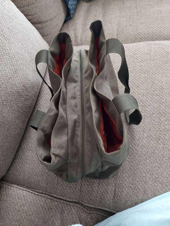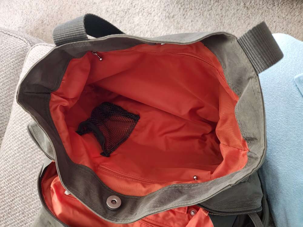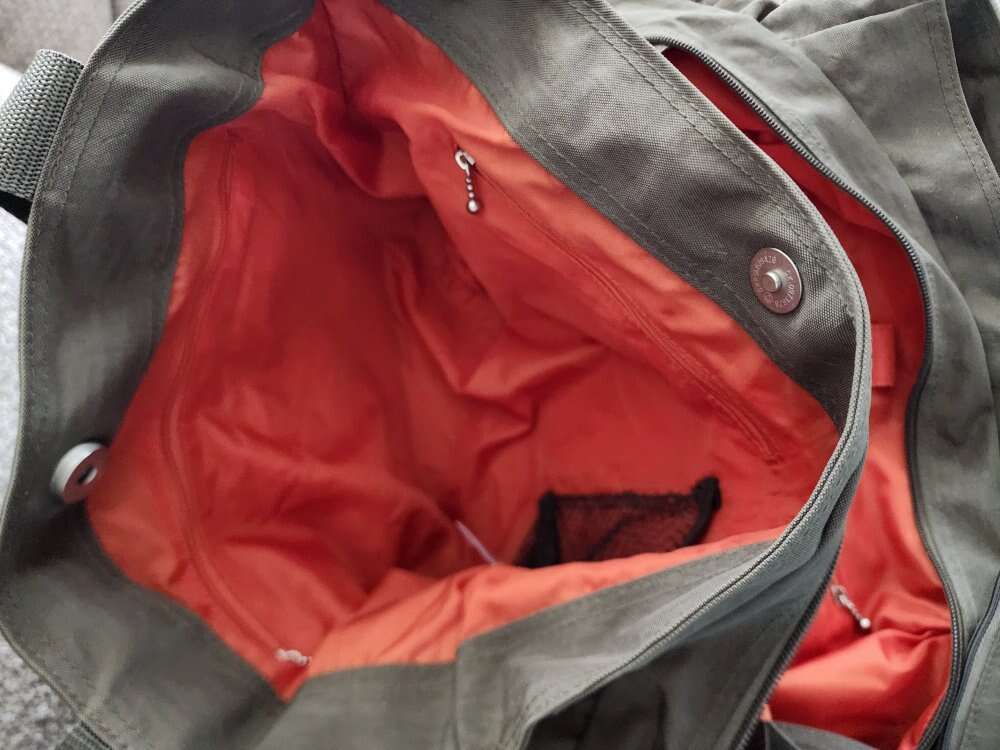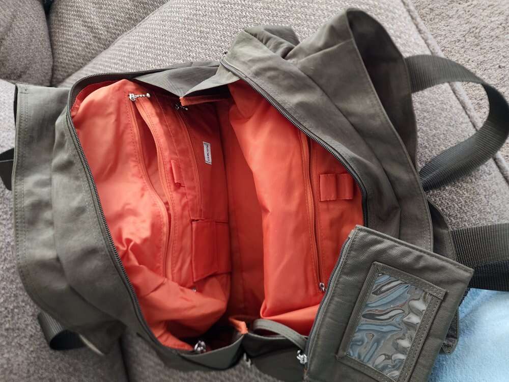 weekender/overnighter lightweight nylon, olive green with orange interior. many pockets and zipper pockets. has smaller 4" x 6" bag inside. 16" wide 10" tall 7.5" bottom width.